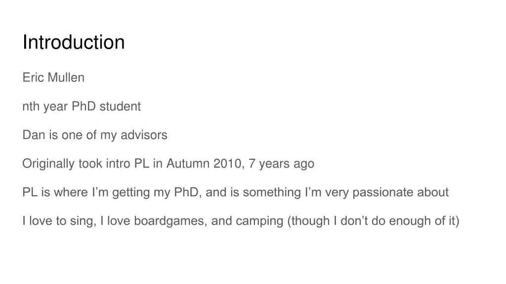 Introduction Eric Mullen nth year PhD student Dan is one of my advisors Originally took intro PL in Autumn 2010, 7 years ago PL is where I m getting my PhD, and is something I m very passionate about I love to sing, I love boardgames, and camping (though I don t do enough of it)