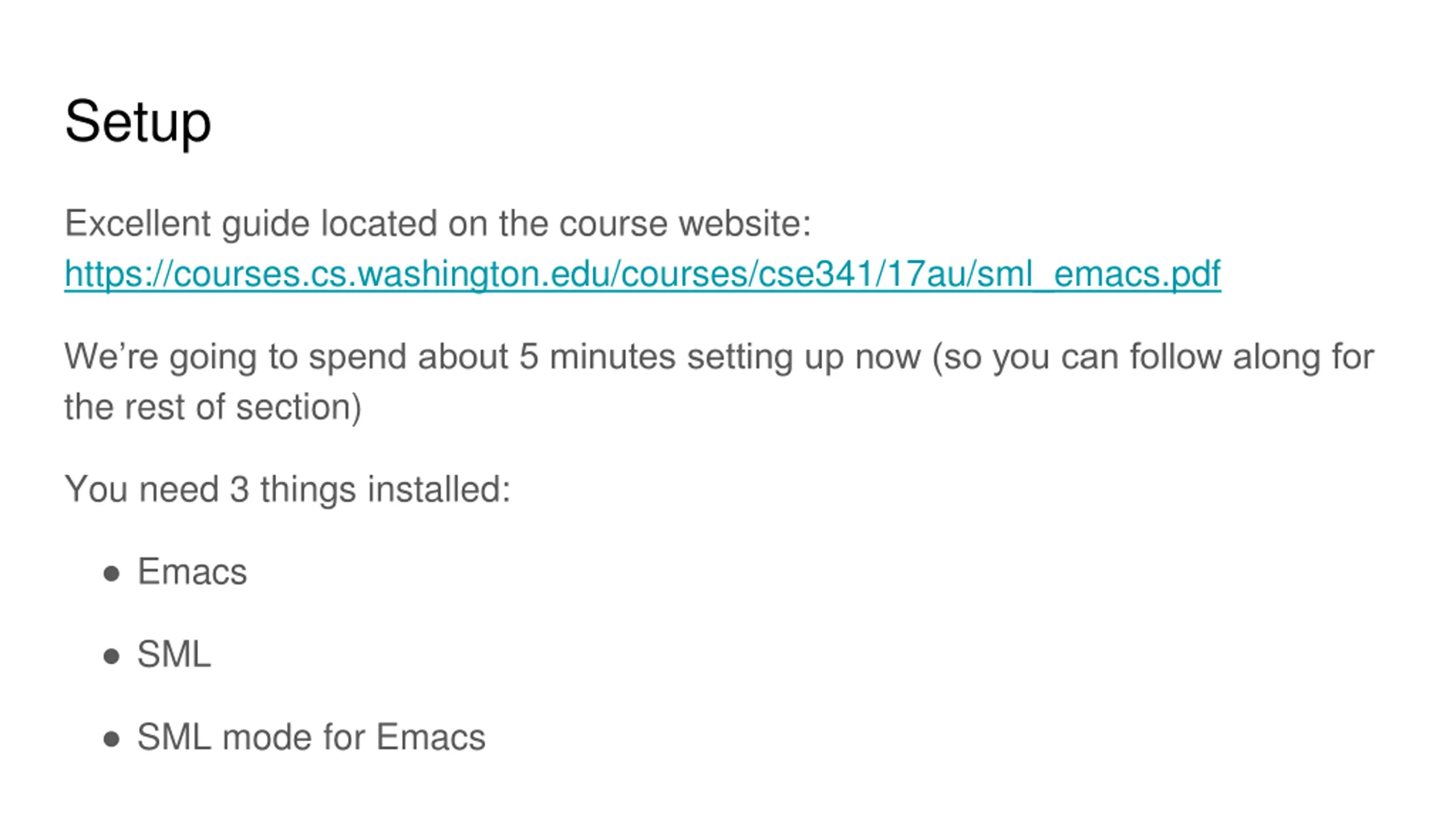 Setup Excellent guide located on the course website: https://courses.cs.washington.edu/courses/cse341/17au/sml_emacs.pdf We re going to spend about 5 minutes setting up now (so you can follow along for the rest of section) You need 3 things installed: Emacs SML SML mode for Emacs