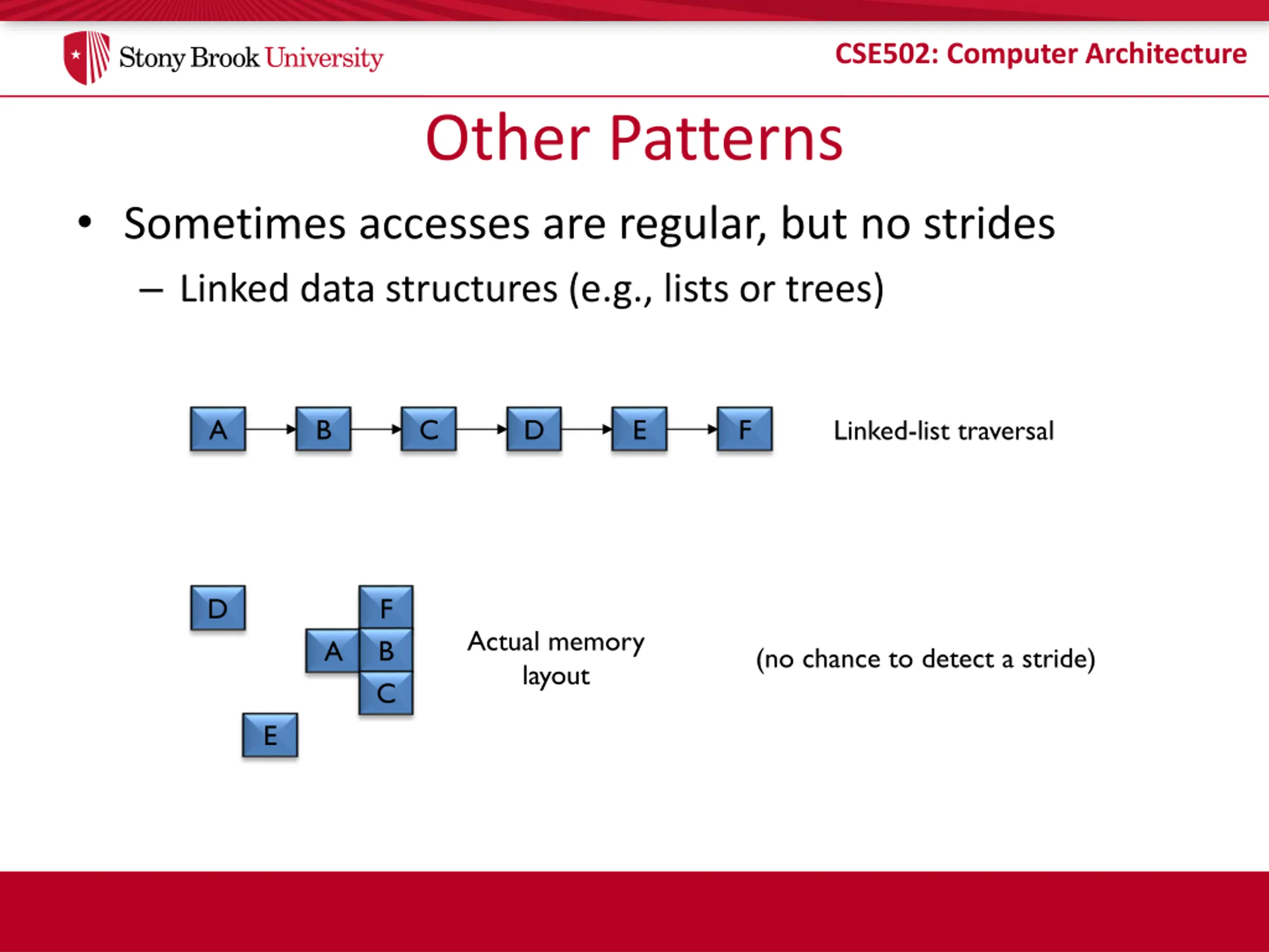 CSE502: Computer Architecture Other Patterns Sometimes accesses are regular, but no strides Linked data structures (e.g., lists or trees) A B C D E F Linked-list traversal D F B C Actual memory layout A (no chance to detect a stride) E
