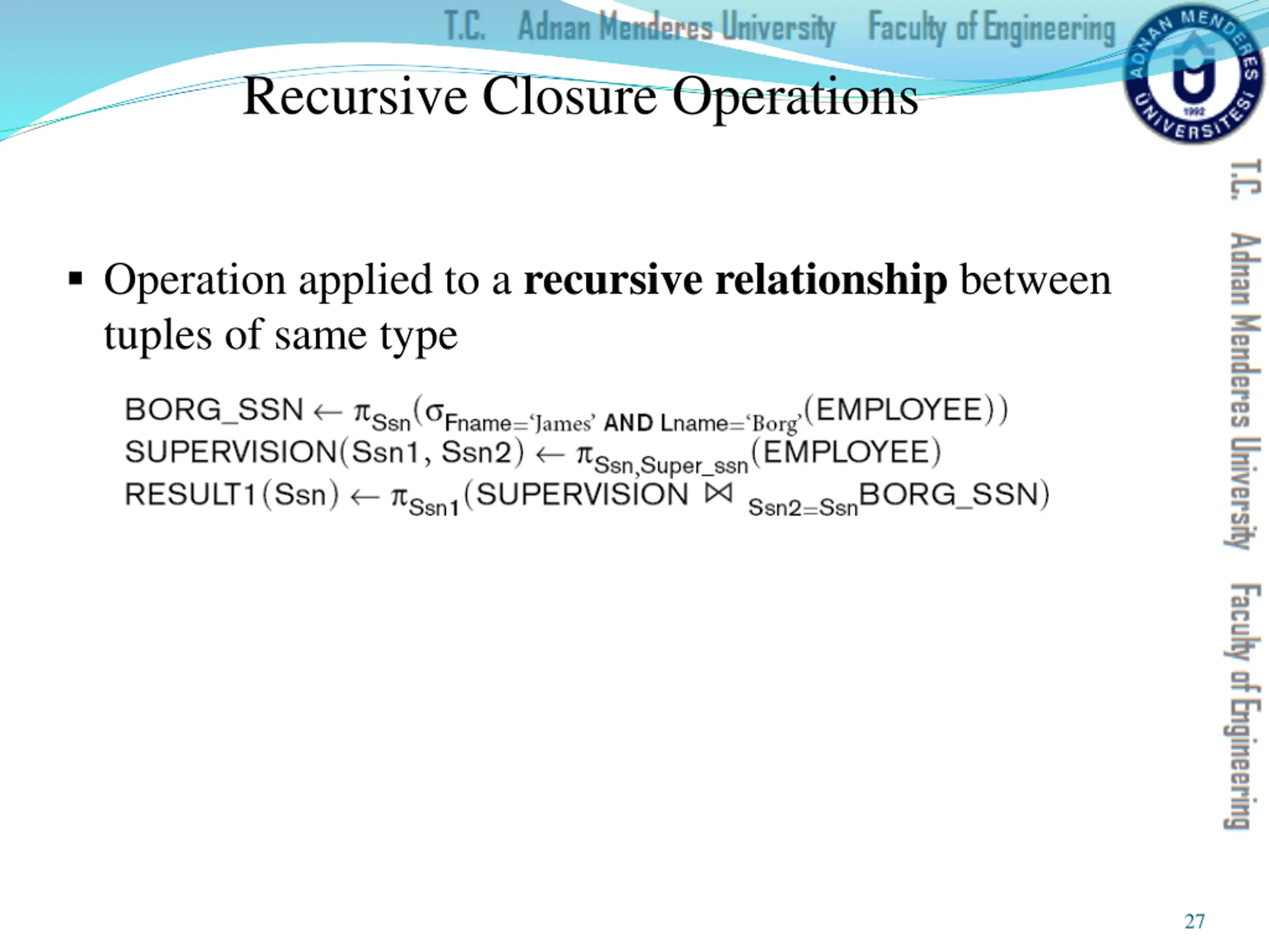 Recursive Closure Operations Operation applied to a recursiverelationship between tuples of same type 27