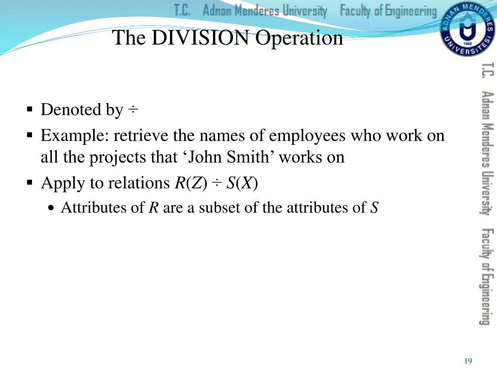 The DIVISION Operation Denoted by Example: retrieve the names of employees who work on all the projects that John Smith works on Apply to relations R(Z) S(X) Attributes of R are a subset of the attributes of S 19