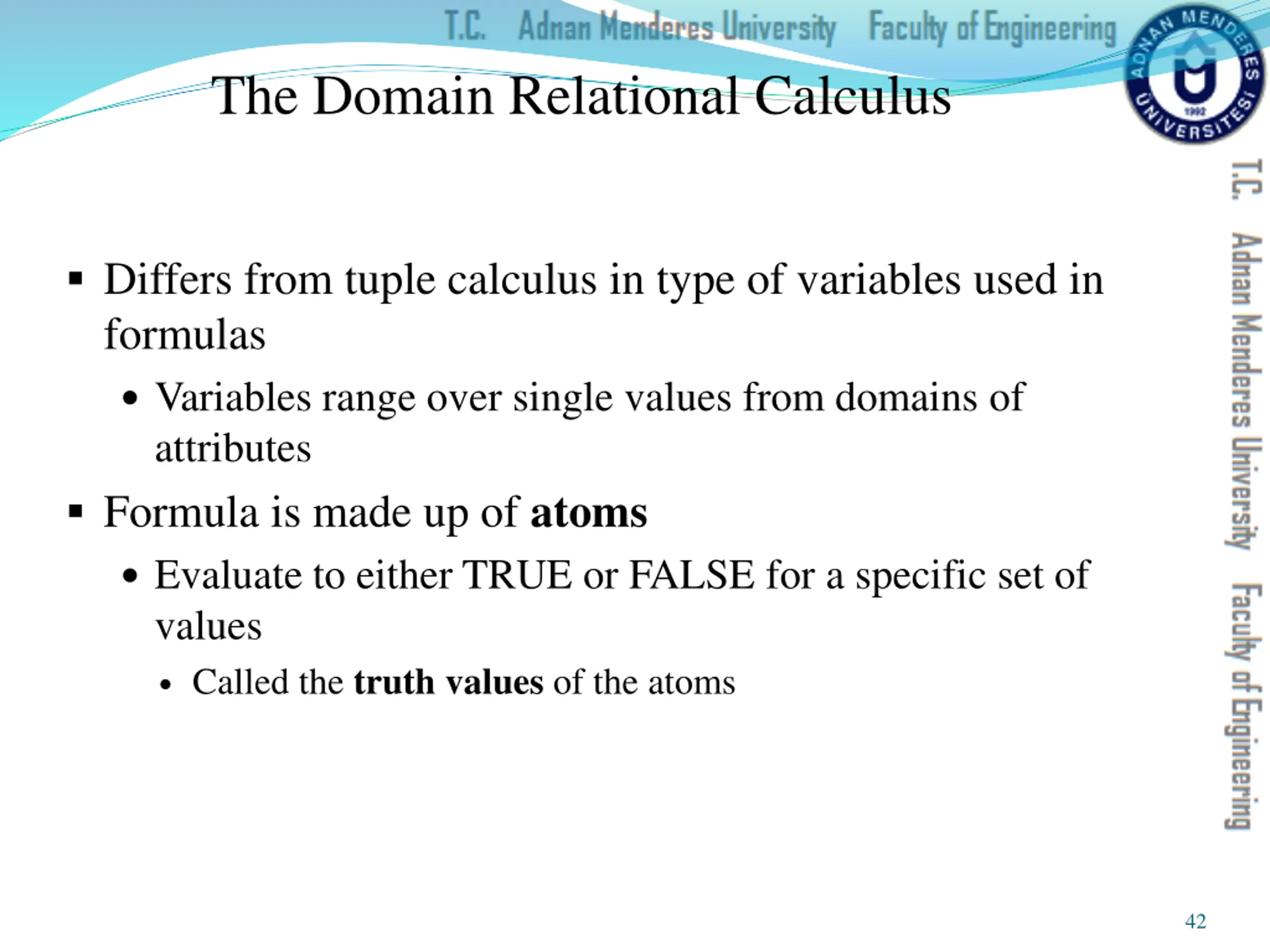 The Domain Relational Calculus Differs from tuple calculus in type of variables used in formulas Variables range over single values from domains of attributes Formula is made up of atoms Evaluate to either TRUE or FALSE for a specific set of values Called the truth values of the atoms 42