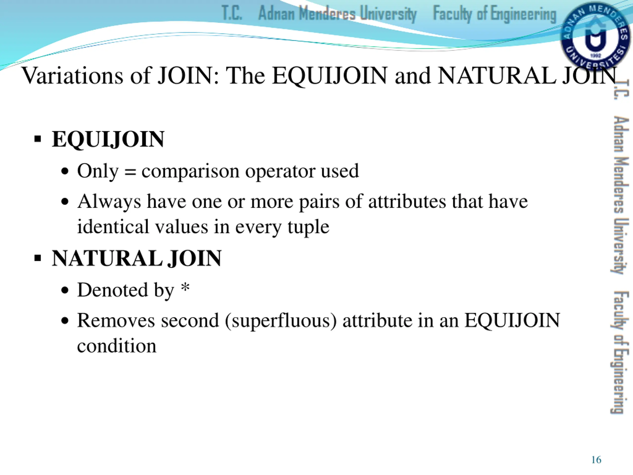 Variations of JOIN: The EQUIJOIN and NATURAL JOIN EQUIJOIN Only = comparison operator used Always have one or more pairs of attributes that have identical values in every tuple NATURAL JOIN Denoted by * Removes second (superfluous) attribute in an EQUIJOIN condition 16