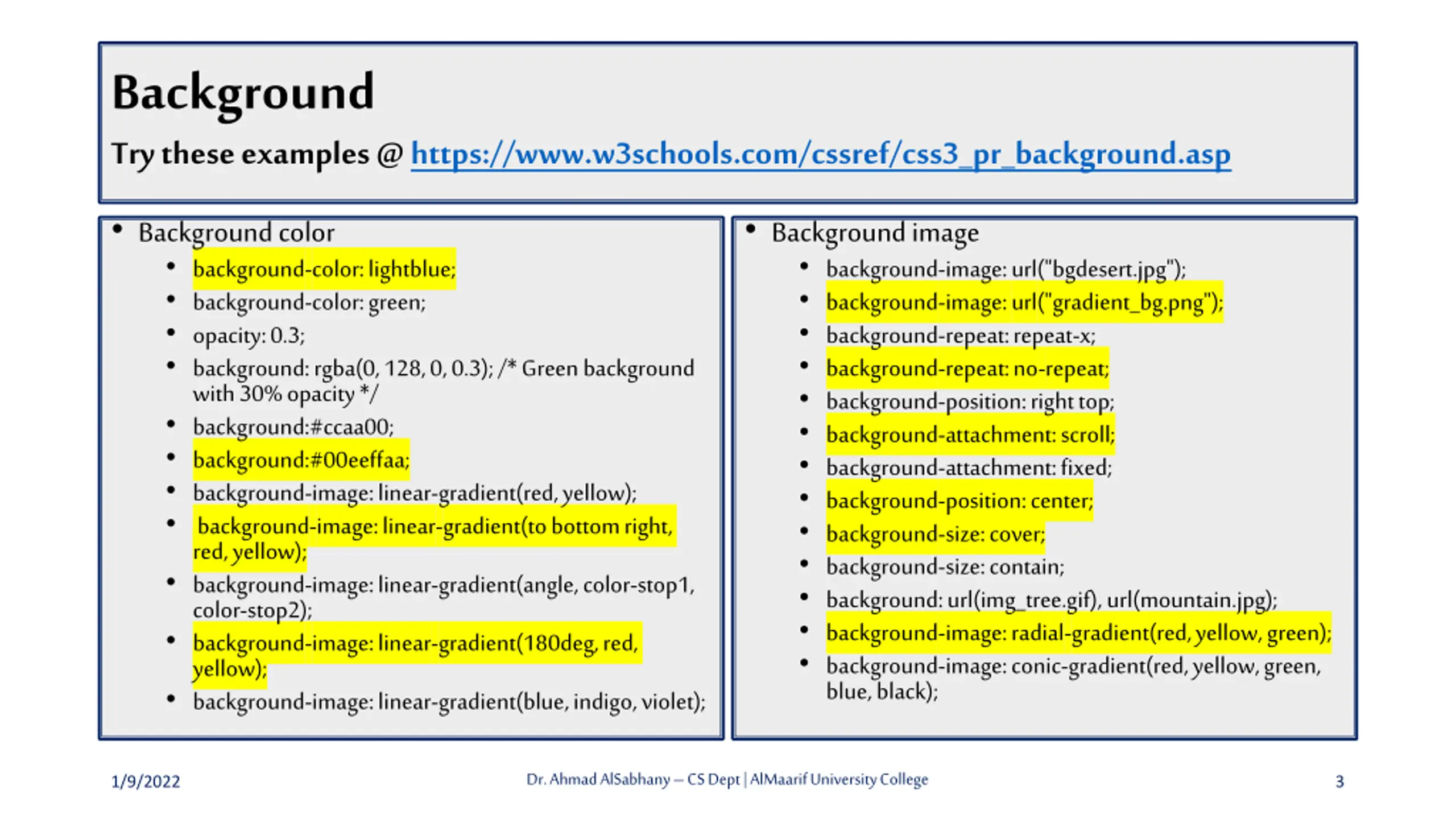 Background Try these examples @ https://www.w3schools.com/cssref/css3_pr_background.asp Background color background-color: lightblue; background-color: green; opacity: 0.3; background: rgba(0, 128, 0, 0.3); /* Green background with 30% opacity */ background:#ccaa00; background:#00eeffaa; background-image: linear-gradient(red, yellow); background-image: linear-gradient(to bottom right, red, yellow); background-image: linear-gradient(angle, color-stop1, color-stop2); background-image: linear-gradient(180deg, red, yellow); background-image: linear-gradient(blue, indigo, violet); Background image background-image: url("bgdesert.jpg"); background-image: url("gradient_bg.png"); background-repeat: repeat-x; background-repeat: no-repeat; background-position: right top; background-attachment: scroll; background-attachment: fixed; background-position: center; background-size: cover; background-size: contain; background: url(img_tree.gif), url(mountain.jpg); background-image: radial-gradient(red, yellow, green); background-image: conic-gradient(red, yellow, green, blue, black); Dr. Ahmad AlSabhany CS Dept | AlMaarif University College 1/9/2022 3