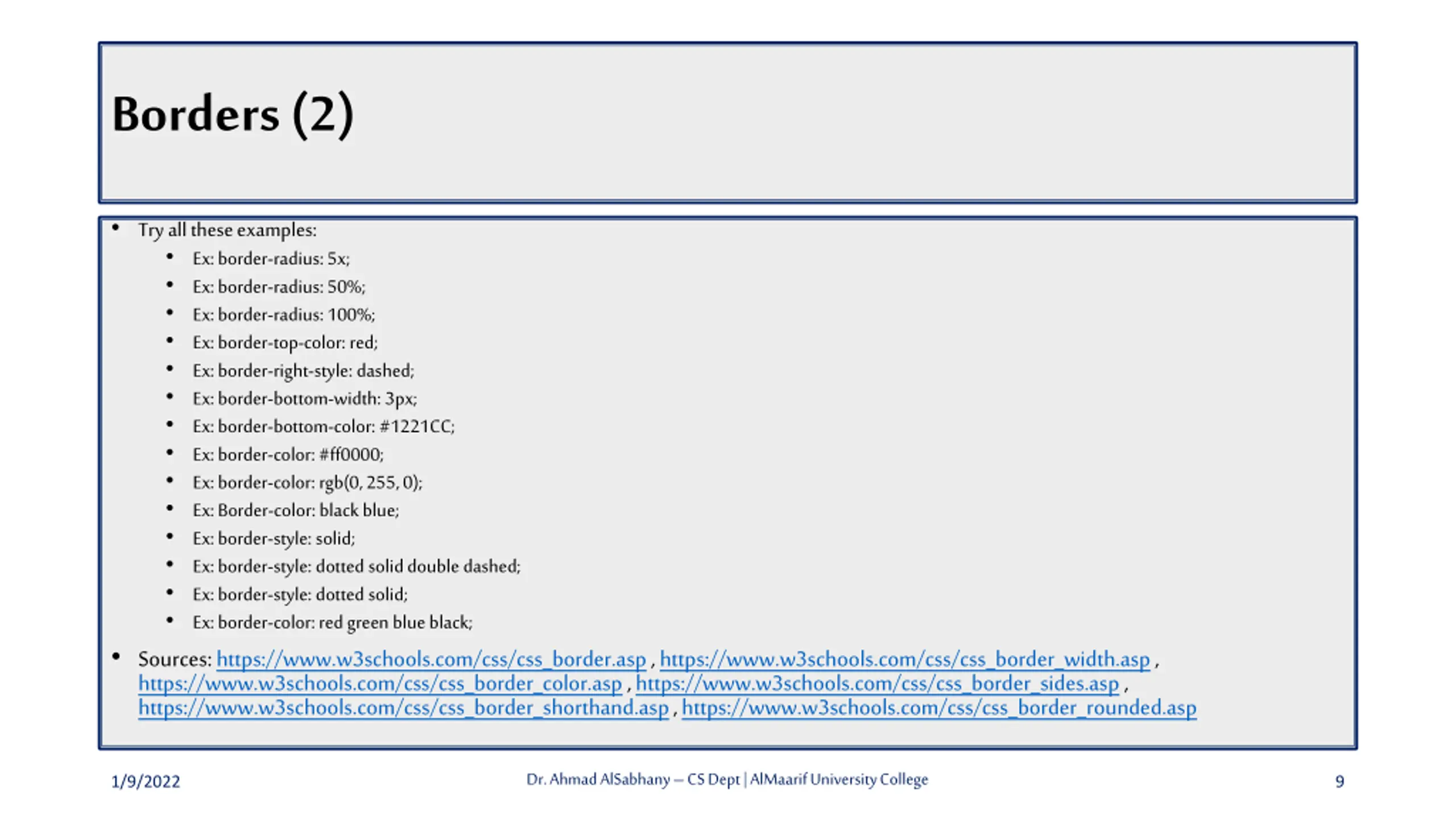 Borders Example of shorthand border: style = border: 5px solid red; border-style: dashed; dotted |Dashed | solid | double | none | hidden border-color: #0400ff; black | red | #0000ff | #257b9c | #9c2567a8 border-width: 2px; 10px; | 1em Borders can be applied in any side: Ex: border-bottom: 5px solid blue; Ex: border-right: 2px dotted #257b9c; Dr. Ahmad AlSabhany CS Dept | AlMaarif University College 1/9/2022 8