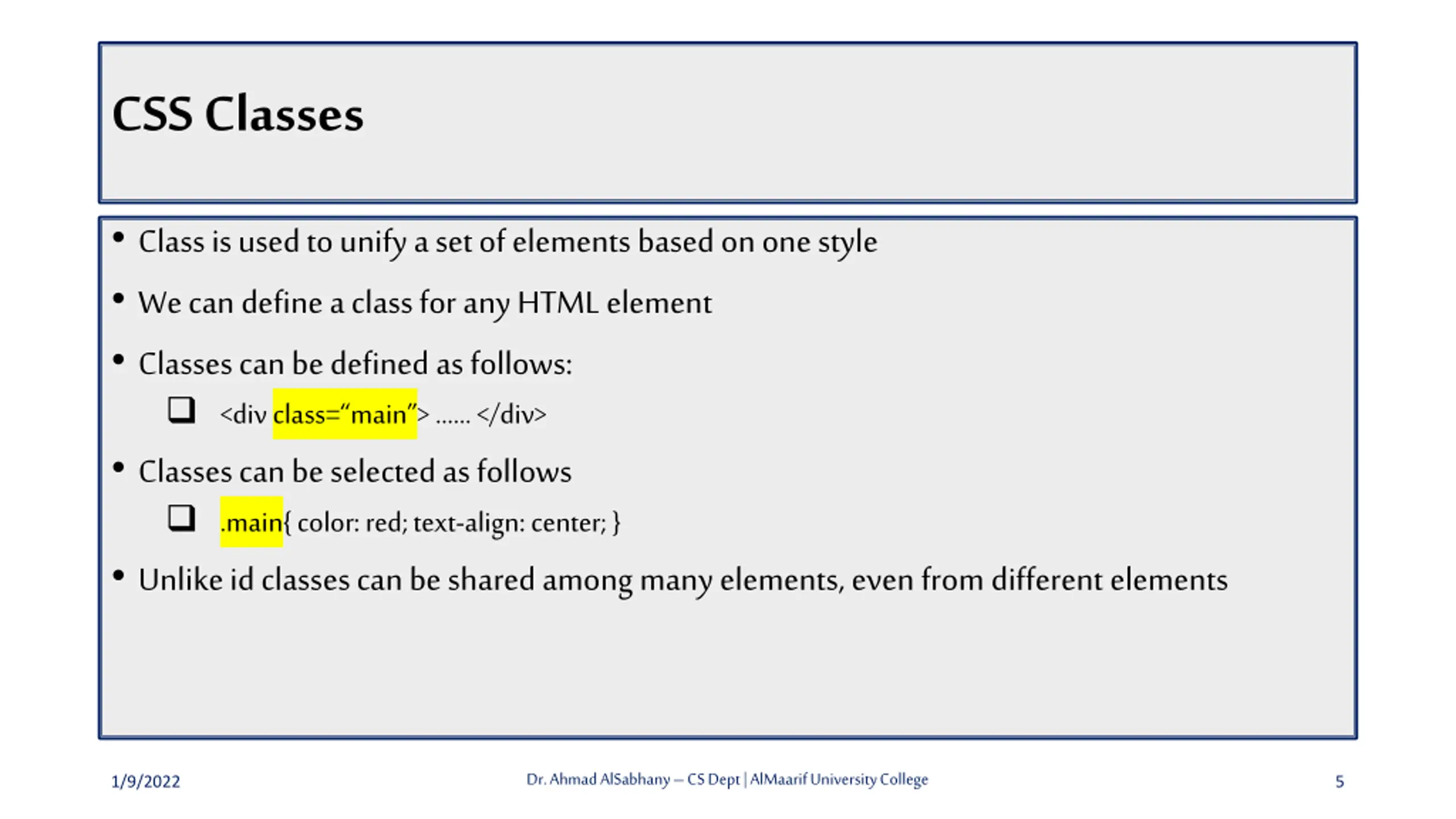 CSS Classes Class is used to unify a set of elements based on one style We can define a class for any HTML element Classes can be defined as follows: <div class= main > </div> Classes can be selected as follows .main{ color: red; text-align: center; } Unlike id classes can be shared among many elements, even from different elements Dr. Ahmad AlSabhany CS Dept | AlMaarif University College 1/9/2022 5