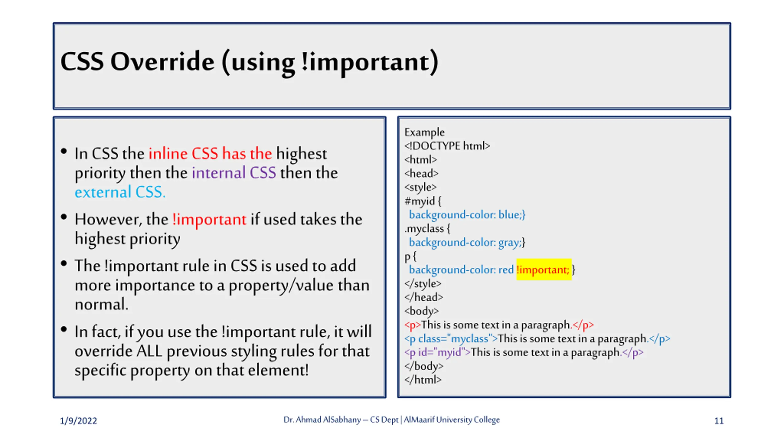CSS Override (using !important) Example <!DOCTYPE html> <html> <head> <style> #myid { background-color: blue;} .myclass { background-color: gray;} p { background-color: red !important; } </style> </head> <body> <p>This is some text in a paragraph.</p> <p class="myclass">This is some text in a paragraph.</p> <p id="myid">This is some text in a paragraph.</p> </body> </html> In CSS the inline CSS has the highest priority then the internal CSS then the external CSS. However, the !important if used takes the highest priority The !important rule in CSS is used to add more importance to a property/value than normal. In fact, if you use the !important rule, it will override ALL previous styling rules for that specific property on that element! Dr. Ahmad AlSabhany CS Dept | AlMaarif University College 1/9/2022 11