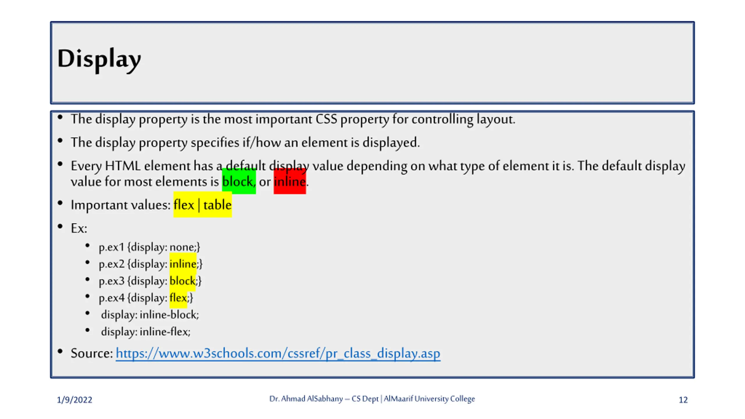 Display The display property is the most important CSS property for controlling layout. The display property specifies if/how an element is displayed. Every HTML element has a default display value depending on what type of element it is. The default display value for most elements is block, or inline. Important values: flex | table Ex: p.ex1 {display: none;} p.ex2 {display: inline;} p.ex3 {display: block;} p.ex4 {display: flex;} display: inline-block; display: inline-flex; Source: https://www.w3schools.com/cssref/pr_class_display.asp Dr. Ahmad AlSabhany CS Dept | AlMaarif University College 1/9/2022 12