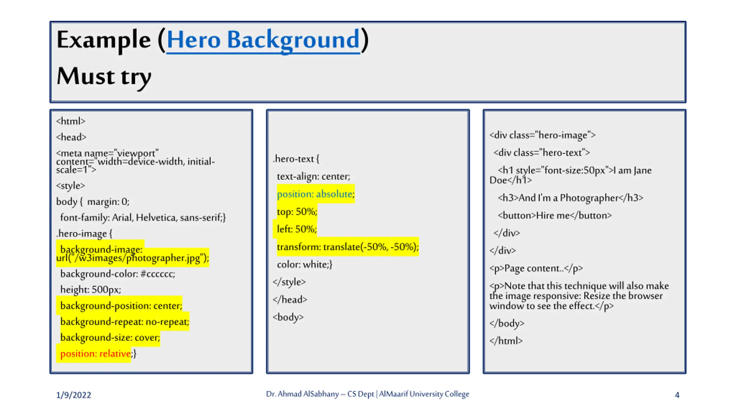 Example (Hero Background) Must try <html> <head> <meta name="viewport" content="width=device-width, initial- scale=1"> <style> body { margin: 0; font-family: Arial, Helvetica, sans-serif;} .hero-image { background-image: url("/w3images/photographer.jpg"); background-color: #cccccc; height: 500px; background-position: center; background-repeat: no-repeat; background-size: cover; position: relative;} <div class="hero-image"> <div class="hero-text"> <h1 style="font-size:50px">I am Jane Doe</h1> <h3>And I'm a Photographer</h3> <button>Hire me</button> </div> </div> <p>Page content..</p> <p>Note that this technique will also make the image responsive: Resize the browser window to see the effect.</p> </body> </html> .hero-text { text-align: center; position: absolute; top: 50%; left: 50%; transform: translate(-50%, -50%); color: white;} </style> </head> <body> Dr. Ahmad AlSabhany CS Dept | AlMaarif University College 1/9/2022 4