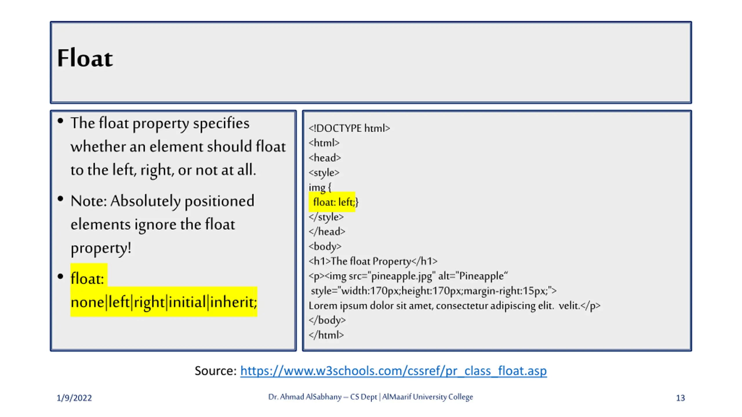 Float The float property specifies whether an element should float to the left, right, or not at all. Note: Absolutely positioned elements ignore the float property! float: none|left|right|initial|inherit; <!DOCTYPE html> <html> <head> <style> img { float: left;} </style> </head> <body> <h1>The float Property</h1> <p><img src="pineapple.jpg" alt="Pineapple style="width:170px;height:170px;margin-right:15px;"> Lorem ipsum dolor sit amet, consectetur adipiscing elit. velit.</p> </body> </html> Source: https://www.w3schools.com/cssref/pr_class_float.asp Dr. Ahmad AlSabhany CS Dept | AlMaarif University College 1/9/2022 13