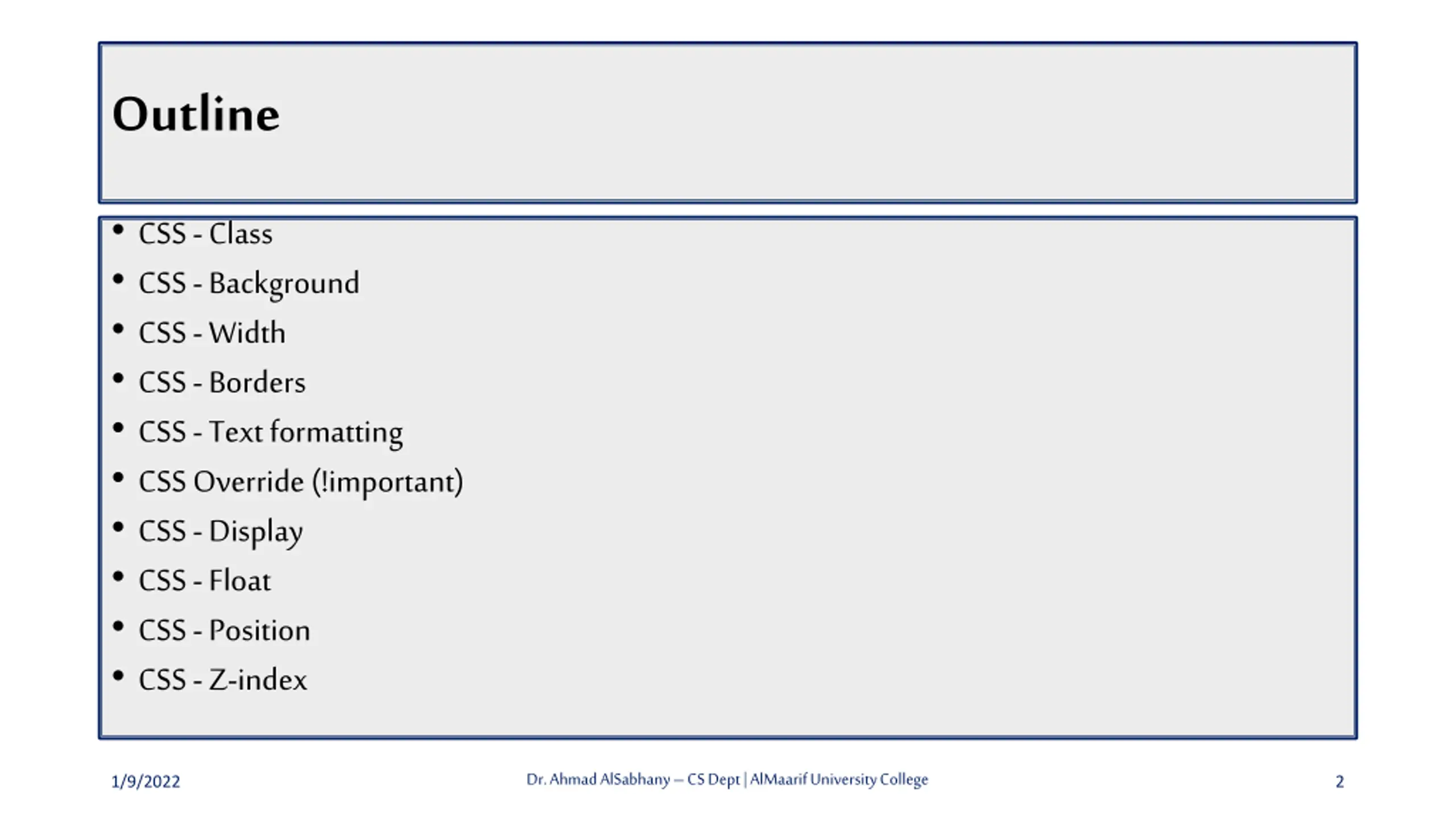 Outline CSS -Class CSS -Background CSS -Width CSS -Borders CSS -Text formatting CSS Override (!important) CSS -Display CSS -Float CSS -Position CSS -Z-index Dr. Ahmad AlSabhany CS Dept | AlMaarif University College 1/9/2022 2