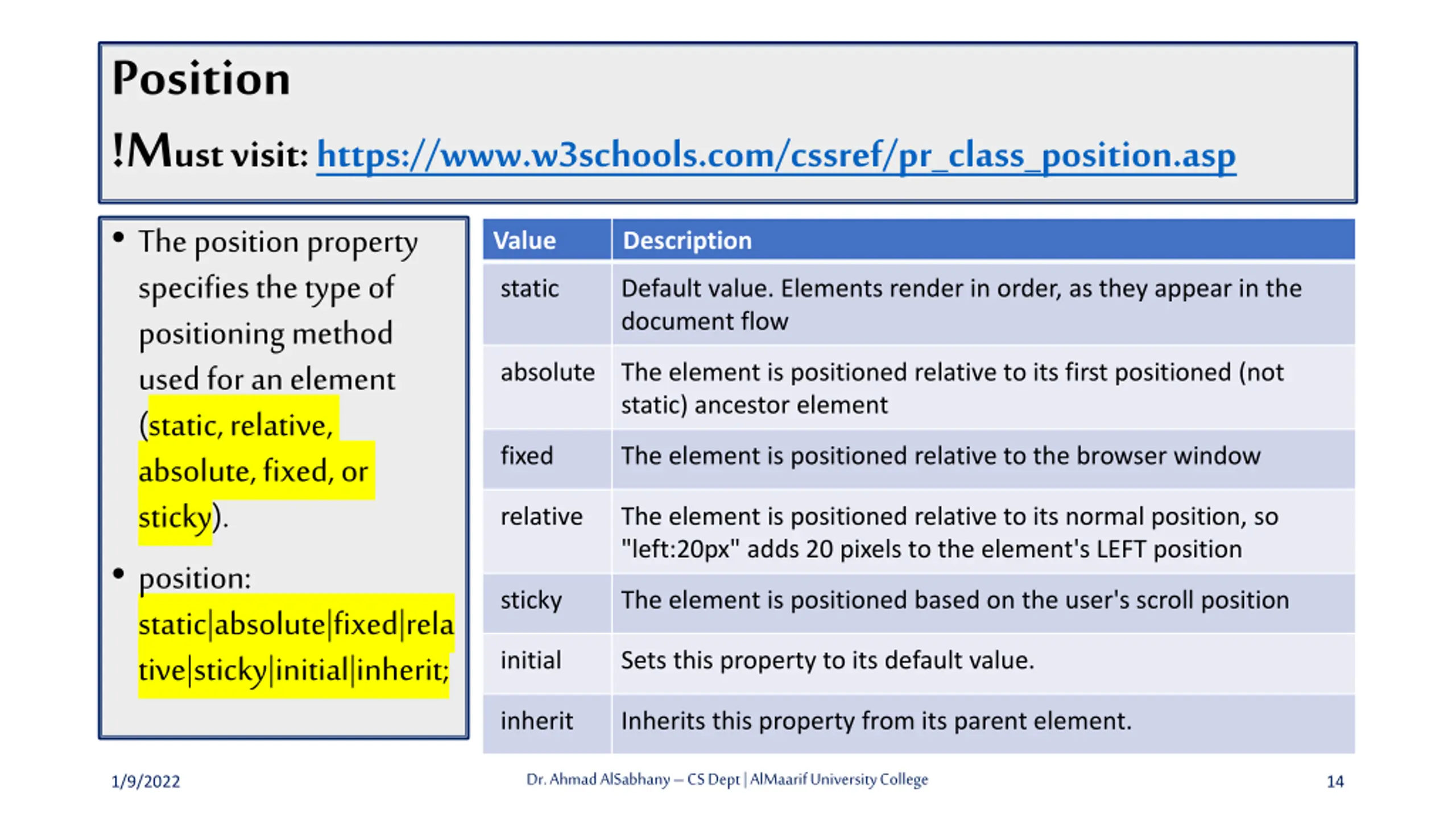Position !Must visit: https://www.w3schools.com/cssref/pr_class_position.asp The position property specifies the type of positioning method used for an element (static, relative, absolute, fixed, or sticky). position: static|absolute|fixed|rela tive|sticky|initial|inherit; inherit Inherits this property from its parent element. Value Description static Default value. Elements render in order, as they appear in the document flow absolute The element is positioned relative to its first positioned (not static) ancestor element fixed The element is positioned relative to the browser window relative The element is positioned relative to its normal position, so "left:20px" adds 20 pixels to the element's LEFT position sticky The element is positioned based on the user's scroll position initial Sets this property to its default value. Dr. Ahmad AlSabhany CS Dept | AlMaarif University College 1/9/2022 14