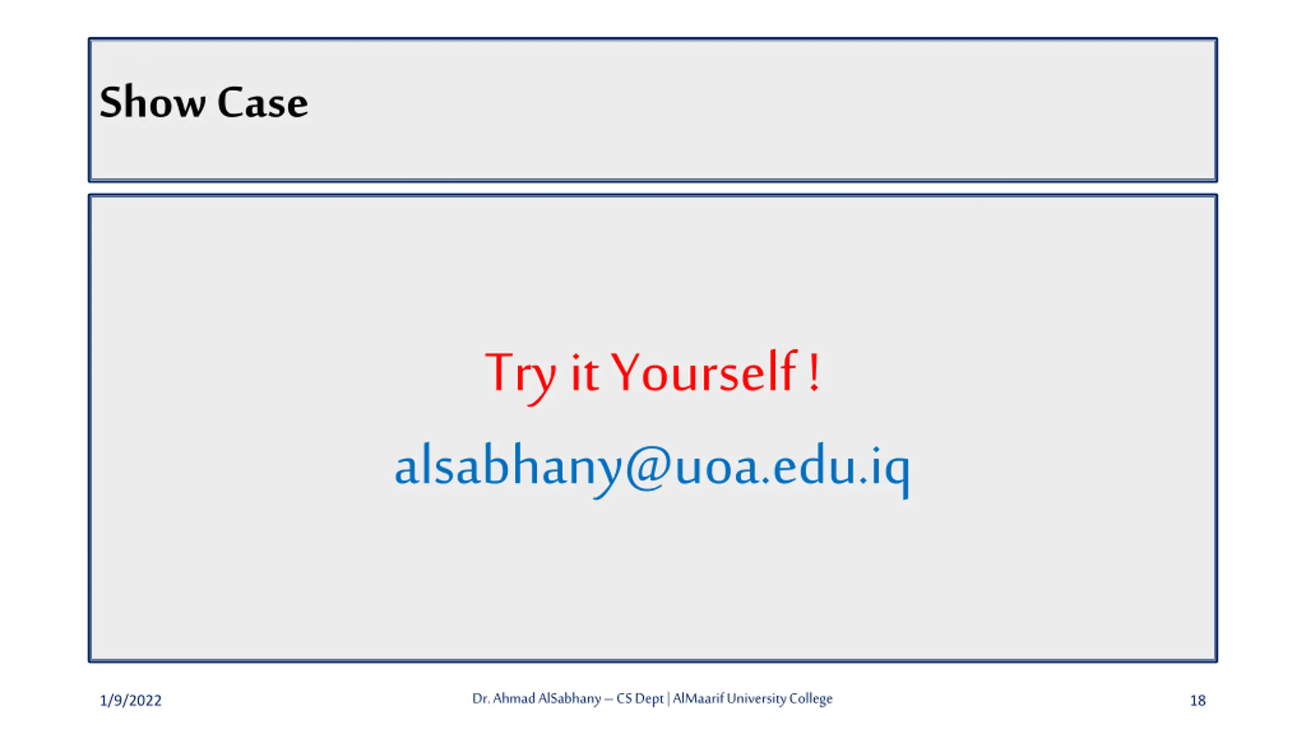 Show Case Try it Yourself ! alsabhany@uoa.edu.iq Dr. Ahmad AlSabhany CS Dept | AlMaarif University College 1/9/2022 18
