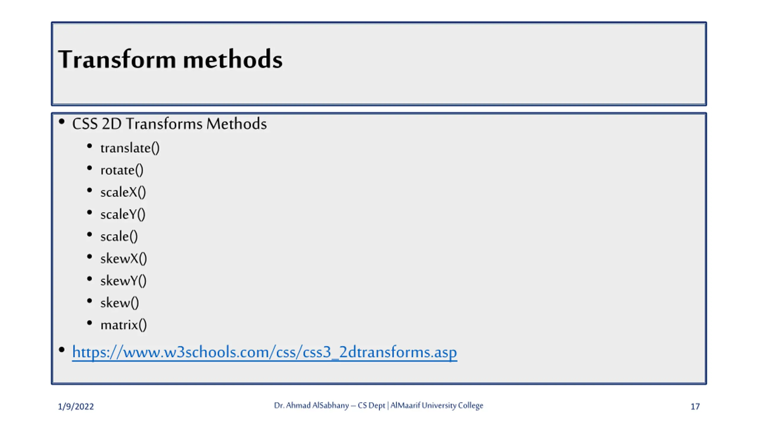 Transform methods CSS 2D Transforms Methods translate() rotate() scaleX() scaleY() scale() skewX() skewY() skew() matrix() https://www.w3schools.com/css/css3_2dtransforms.asp Dr. Ahmad AlSabhany CS Dept | AlMaarif University College 1/9/2022 17
