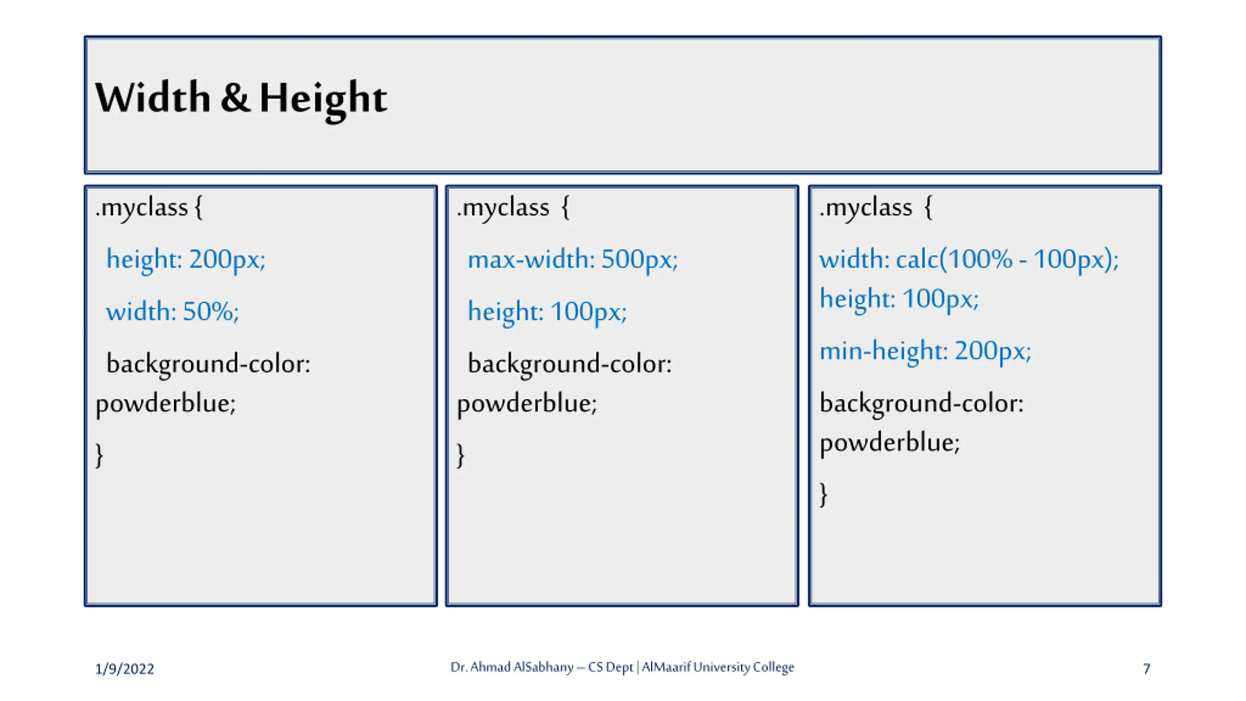 Width & Height .myclass { height: 200px; width: 50%; background-color: powderblue; } .myclass { max-width: 500px; height: 100px; background-color: powderblue; } .myclass { width: calc(100% - 100px); height: 100px; min-height: 200px; background-color: powderblue; } Dr. Ahmad AlSabhany CS Dept | AlMaarif University College 1/9/2022 7