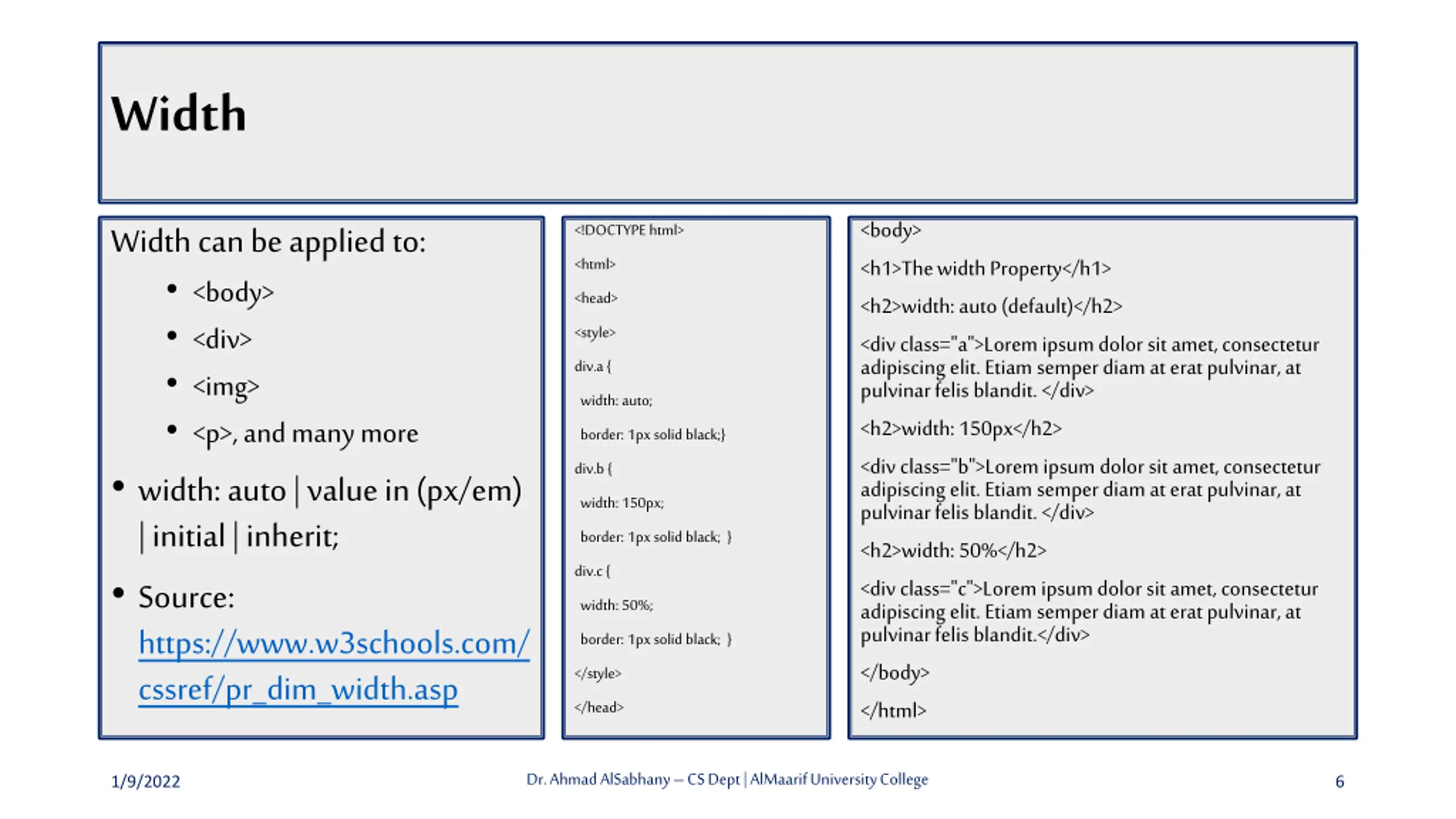Width <body> <h1>The width Property</h1> <h2>width: auto (default)</h2> <div class="a">Lorem ipsum dolor sit amet, consectetur adipiscing elit. Etiam semper diam at erat pulvinar, at pulvinar felis blandit. </div> <h2>width: 150px</h2> <div class="b">Lorem ipsum dolor sit amet, consectetur adipiscing elit. Etiam semper diam at erat pulvinar, at pulvinar felis blandit. </div> <h2>width: 50%</h2> <div class="c">Lorem ipsum dolor sit amet, consectetur adipiscing elit. Etiam semper diam at erat pulvinar, at pulvinar felis blandit.</div> </body> </html> Width can be applied to: <body> <div> <img> <p>, and many more width: auto | value in (px/em) | initial | inherit; Source: https://www.w3schools.com/ cssref/pr_dim_width.asp <!DOCTYPE html> <html> <head> <style> div.a { width: auto; border: 1px solid black;} div.b { width: 150px; border: 1px solid black; } div.c { width: 50%; border: 1px solid black; } </style> </head> Dr. Ahmad AlSabhany CS Dept | AlMaarif University College 1/9/2022 6