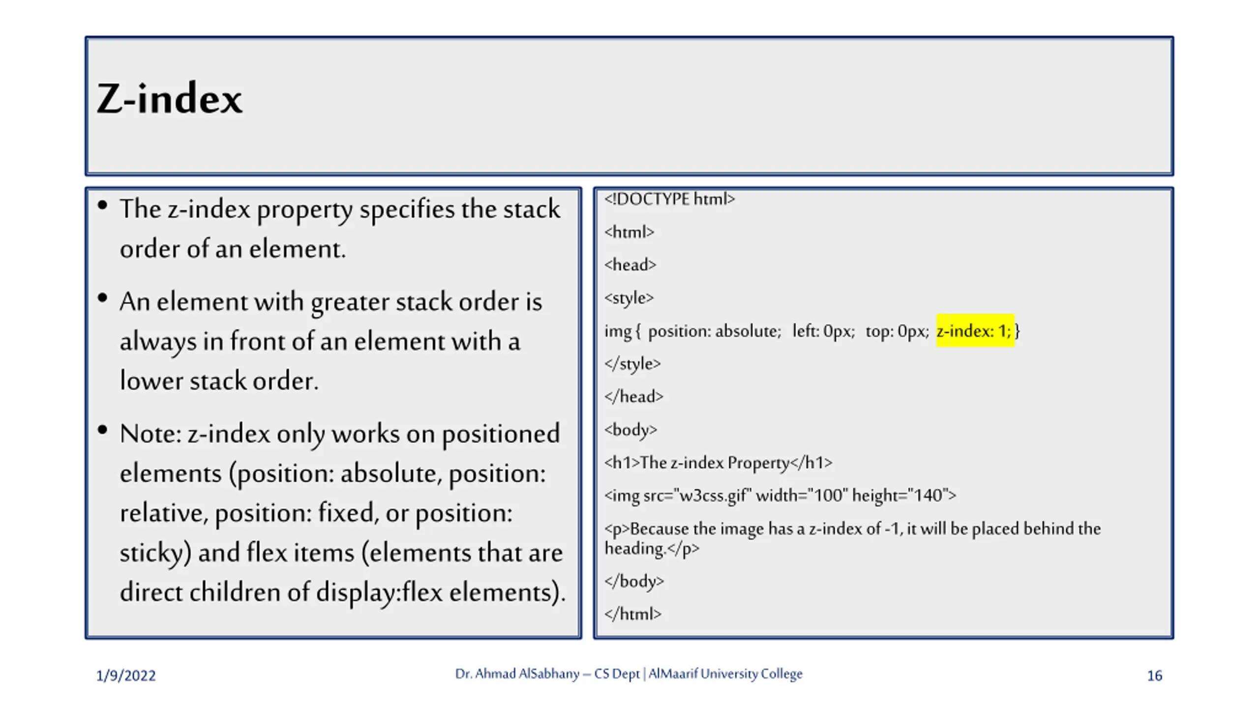 Z-index <!DOCTYPE html> <html> <head> <style> img { position: absolute; left: 0px; top: 0px; z-index: 1; } </style> </head> <body> <h1>The z-index Property</h1> <img src="w3css.gif" width="100" height="140"> <p>Because the image has a z-index of -1, it will be placed behind the heading.</p> </body> </html> The z-index property specifies the stack order of an element. An element with greater stack order is always in front of an element with a lower stack order. Note: z-index only works on positioned elements (position: absolute, position: relative, position: fixed, or position: sticky) and flex items (elements that are direct children of display:flex elements). Dr. Ahmad AlSabhany CS Dept | AlMaarif University College 1/9/2022 16