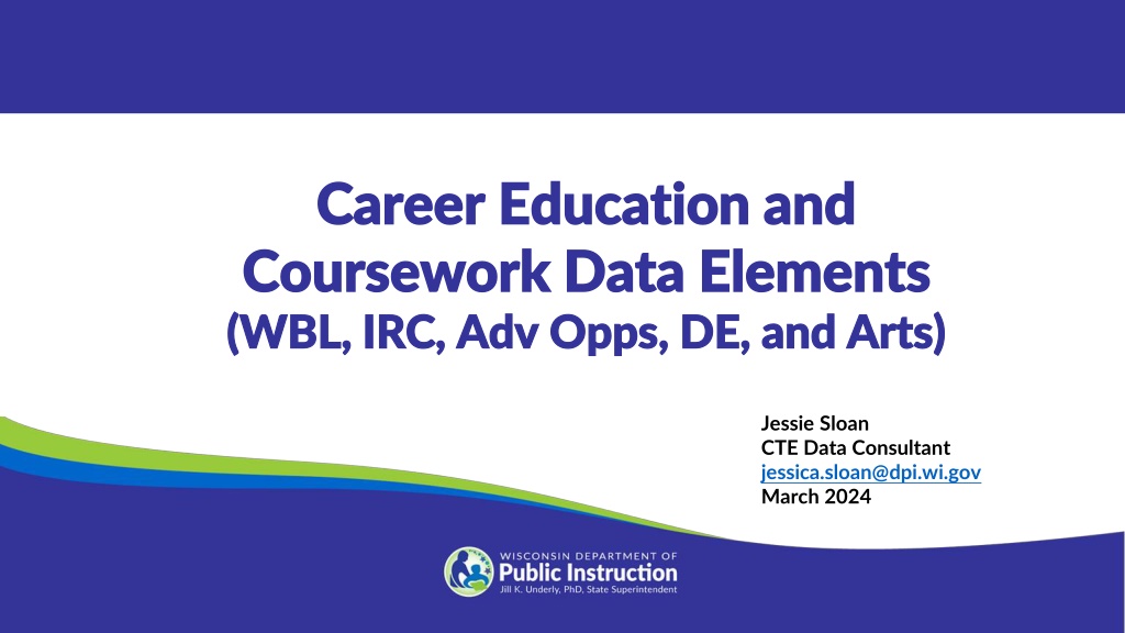 Career Education and Career Education and Coursework Data Elements Coursework Data Elements (WBL, IRC, Adv Opps, DE, and Arts) (WBL, IRC, Adv Opps, DE, and Arts) Jessie Sloan CTE Data Consultant jessica.sloan@dpi.wi.gov March 2024