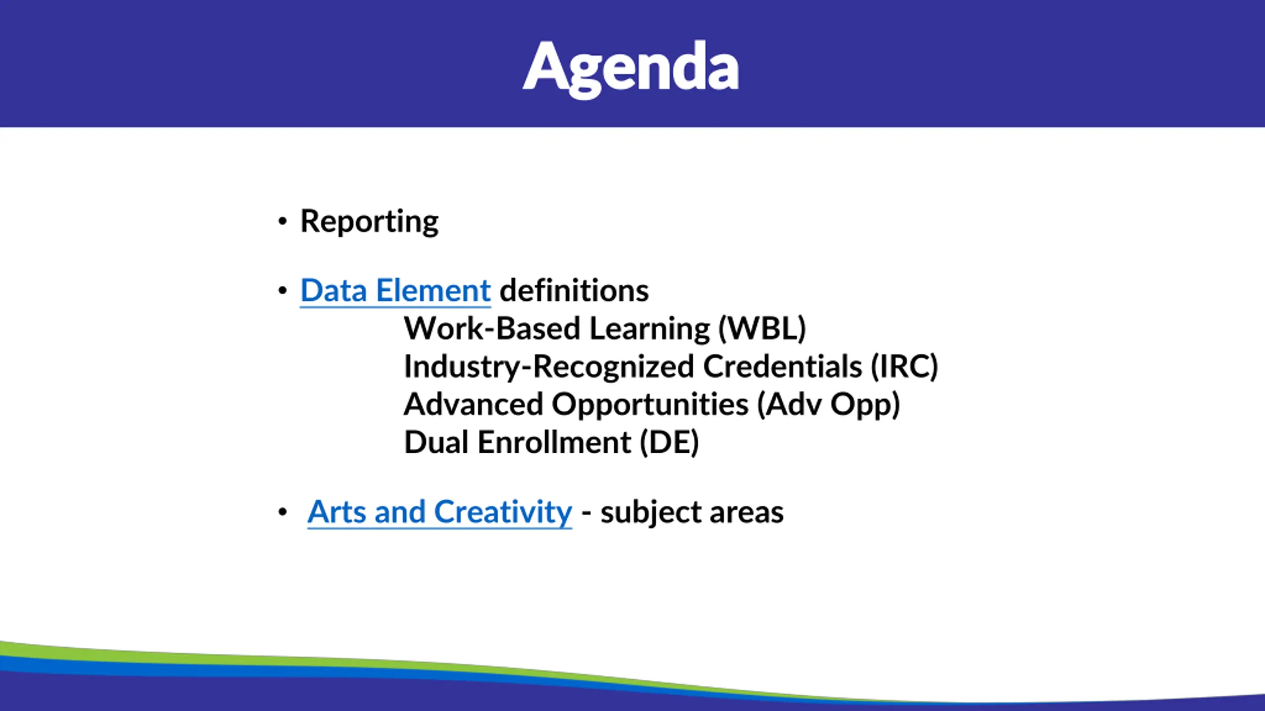 Agenda Agenda Reporting Data Element definitions Work-Based Learning (WBL) Industry-Recognized Credentials (IRC) Advanced Opportunities (Adv Opp) Dual Enrollment (DE) Arts and Creativity - subject areas