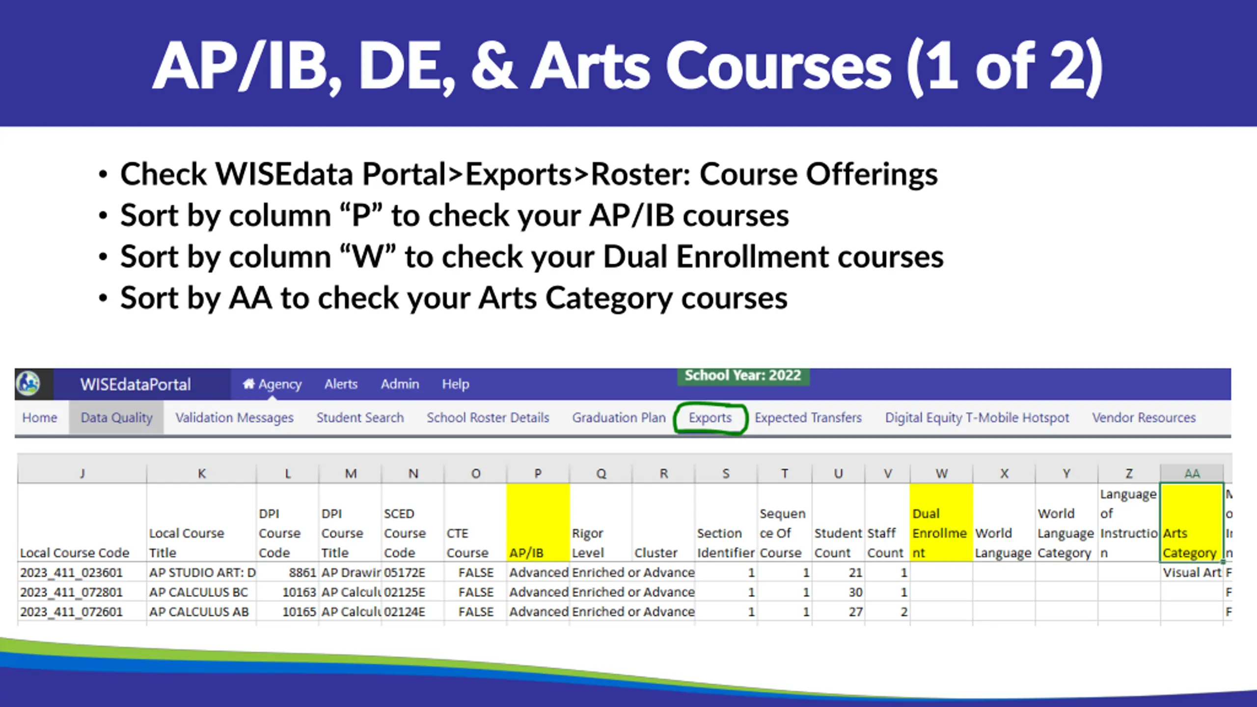 AP/IB, DE, & Arts Courses (1 of 2) AP/IB, DE, & Arts Courses (1 of 2) Check WISEdata Portal>Exports>Roster: Course Offerings Sort by column P to check your AP/IB courses Sort by column W to check your Dual Enrollment courses Sort by AA to check your Arts Category courses