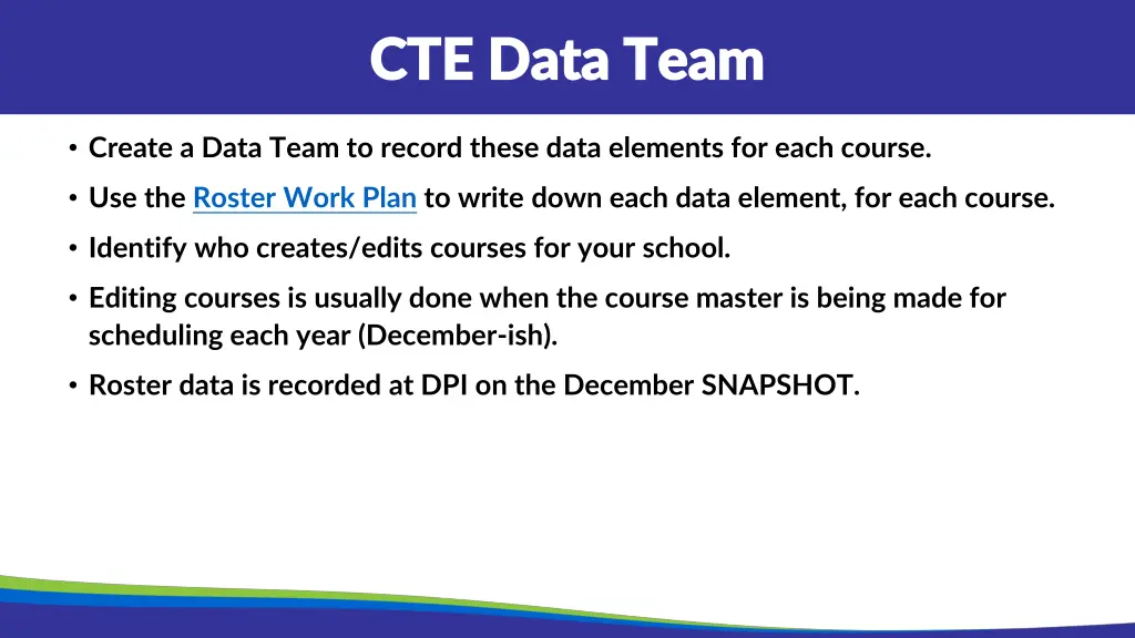 CTE Data Team CTE Data Team Create a Data Team to record these data elements for each course. Use the Roster Work Plan to write down each data element, for each course. Identify who creates/edits courses for your school. Editing courses is usually done when the course master is being made for scheduling each year (December-ish). Roster data is recorded at DPI on the December SNAPSHOT.