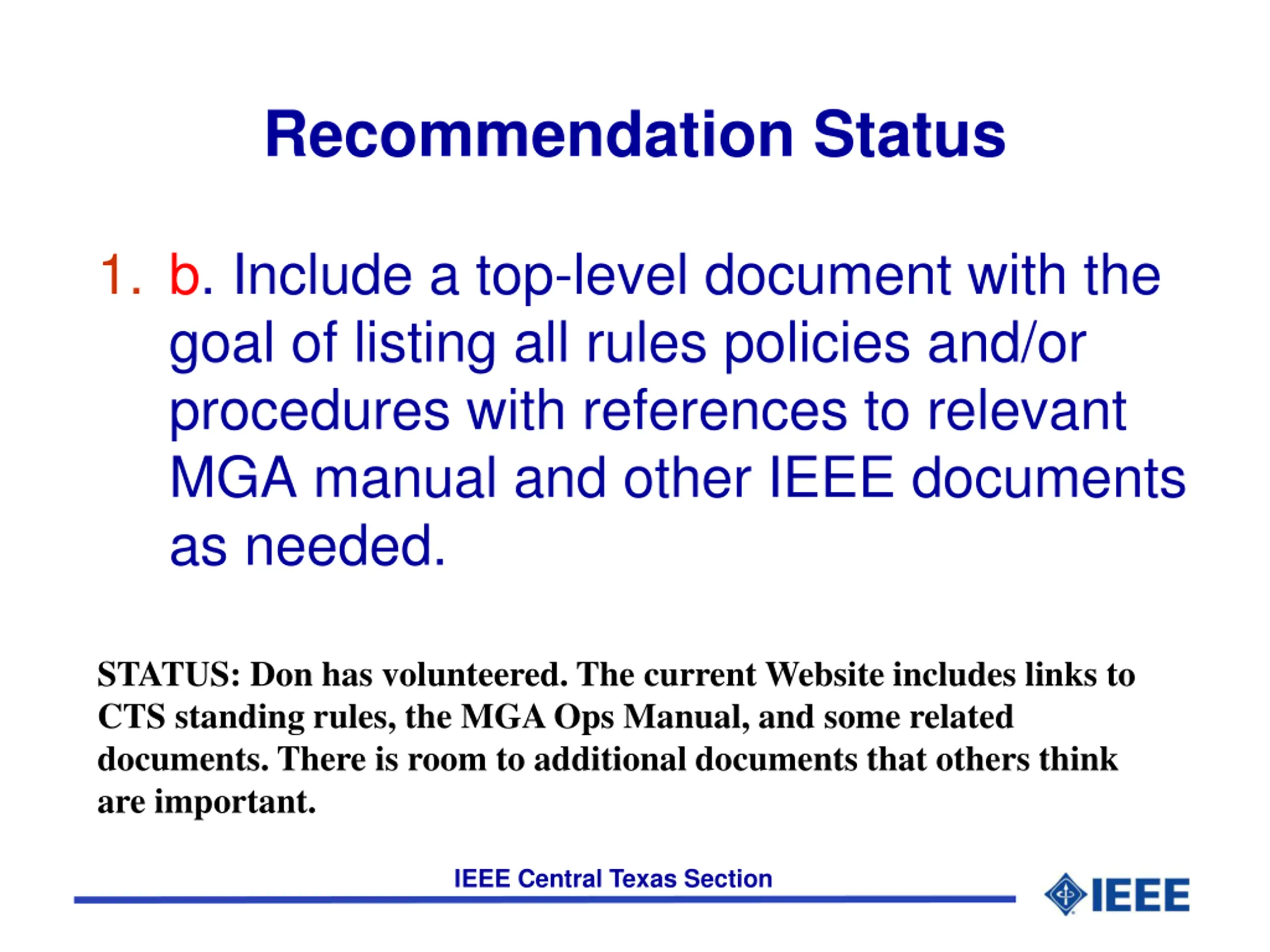 Recommendation Status 1. b. Include a top-level document with the goal of listing all rules policies and/or procedures with references to relevant MGA manual and other IEEE documents as needed. STATUS: Don has volunteered. The current Website includes links to CTS standing rules, the MGA Ops Manual, and some related documents. There is room to additional documents that others think are important. IEEE Central Texas Section
