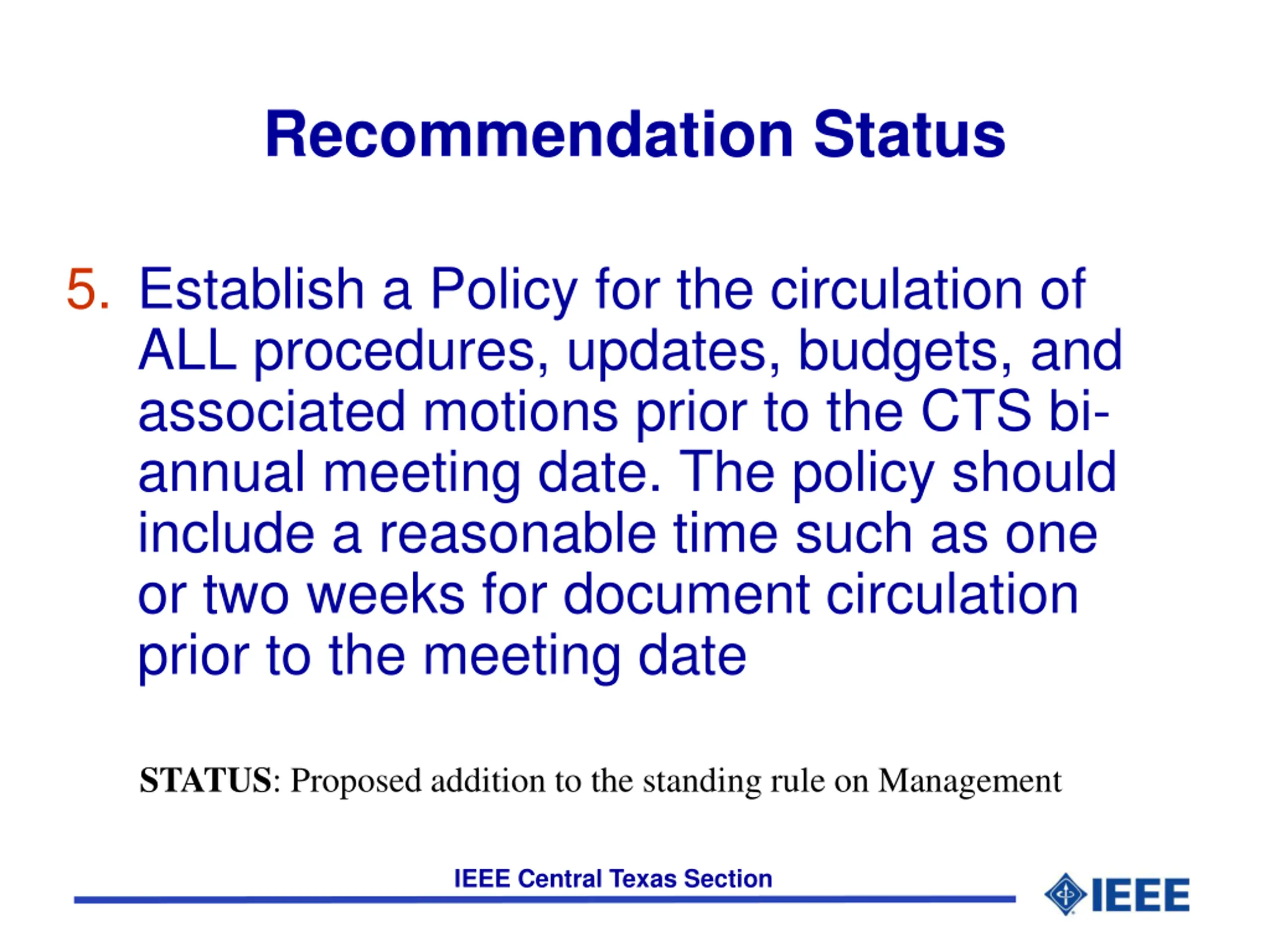 Recommendation Status 5. Establish a Policy for the circulation of ALL procedures, updates, budgets, and associated motions prior to the CTS bi- annual meeting date. The policy should include a reasonable time such as one or two weeks for document circulation prior to the meeting date STATUS: Proposed addition to the standing rule on Management IEEE Central Texas Section