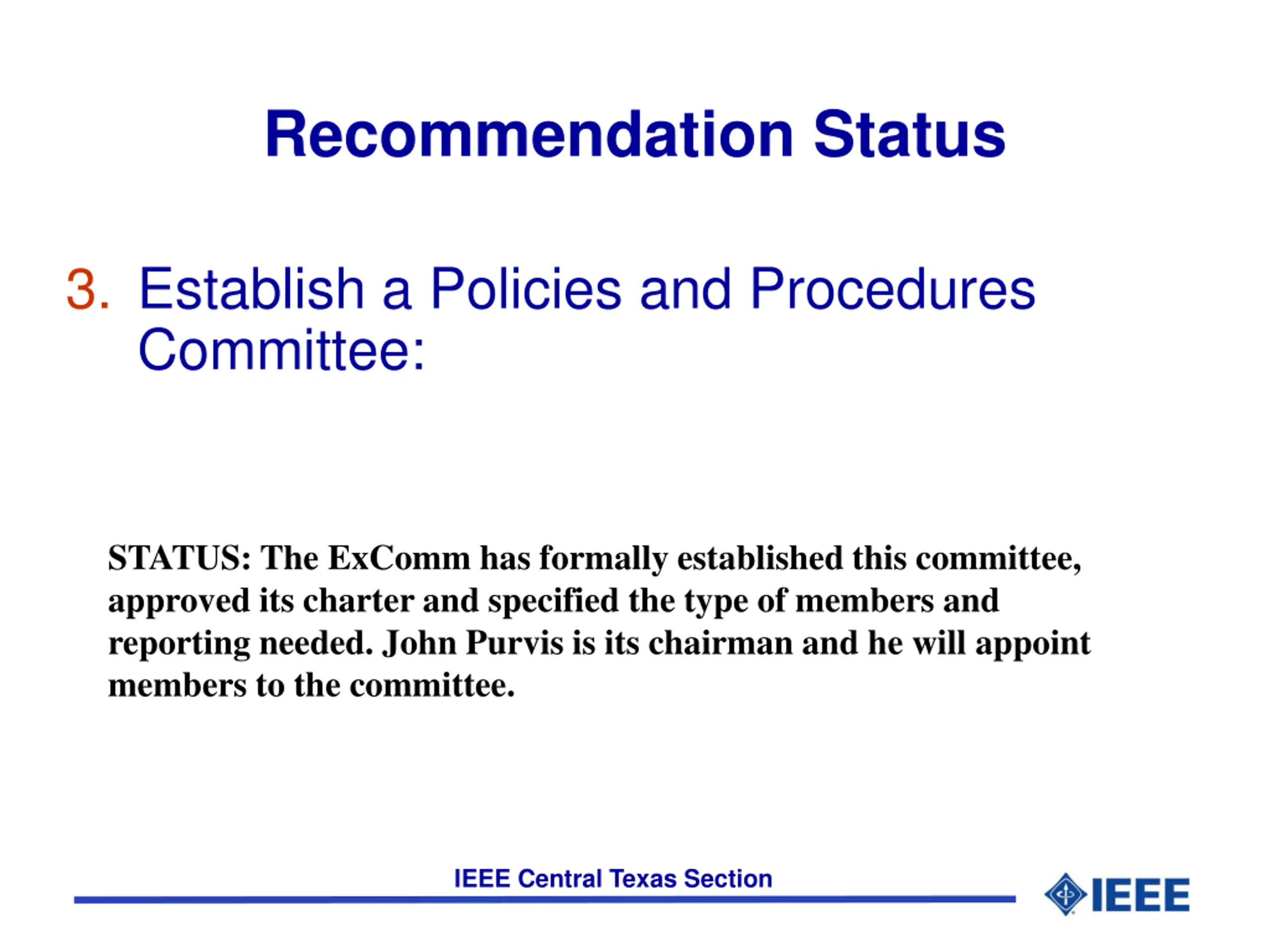 Recommendation Status 3. Establish a Policies and Procedures Committee: STATUS: The ExComm has formally established this committee, approved its charter and specified the type of members and reporting needed. John Purvis is its chairman and he will appoint members to the committee. IEEE Central Texas Section