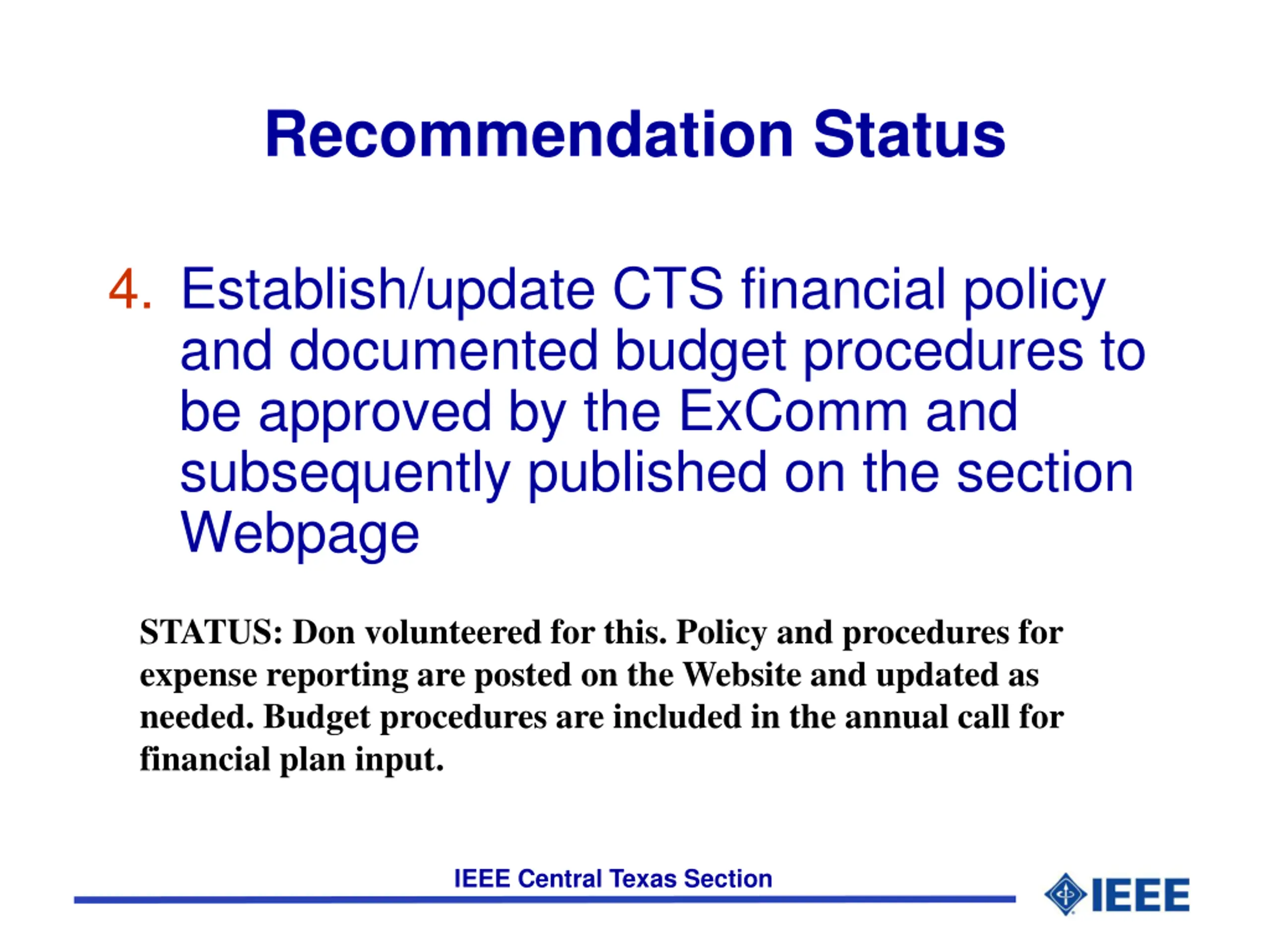 Recommendation Status 4. Establish/update CTS financial policy and documented budget procedures to be approved by the ExComm and subsequently published on the section Webpage STATUS: Don volunteered for this. Policy and procedures for expense reporting are posted on the Website and updated as needed. Budget procedures are included in the annual call for financial plan input. IEEE Central Texas Section