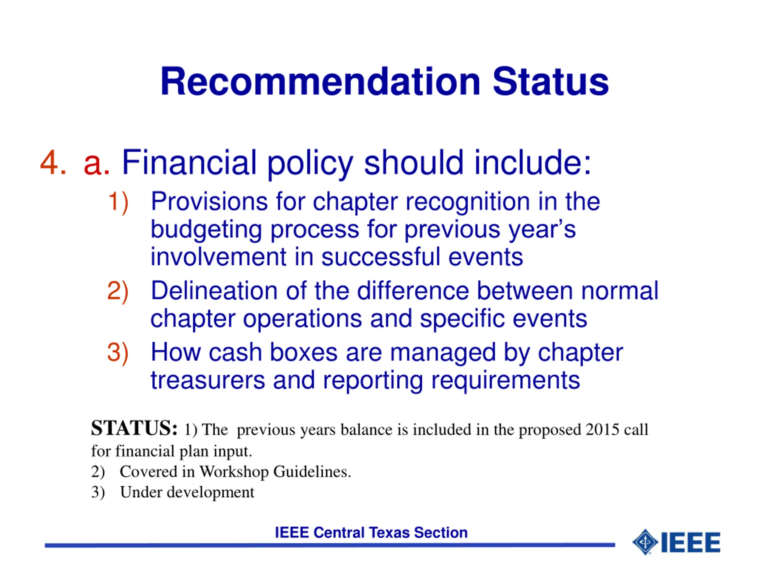 Recommendation Status 4. a. Financial policy should include: 1) Provisions for chapter recognition in the budgeting process for previous year s involvement in successful events 2) Delineation of the difference between normal chapter operations and specific events 3) How cash boxes are managed by chapter treasurers and reporting requirements STATUS:1) The previous years balance is included in the proposed 2015 call for financial plan input. 2) Covered in Workshop Guidelines. 3) Under development IEEE Central Texas Section