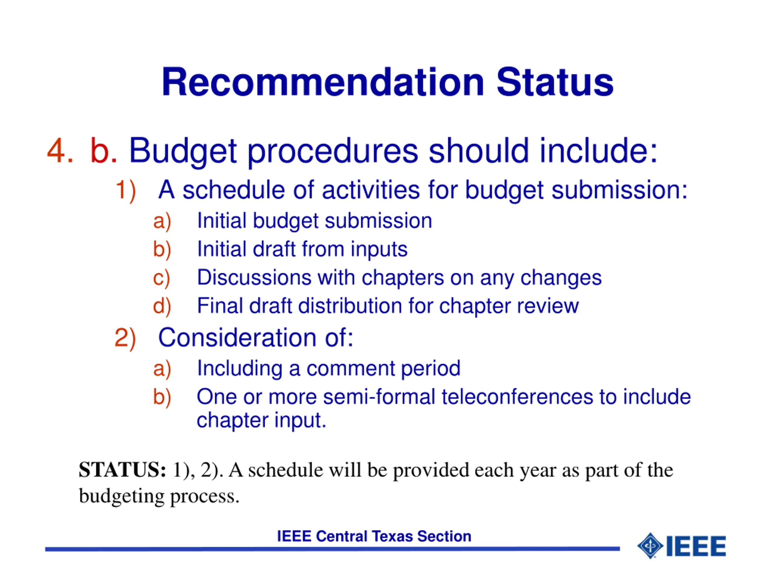Recommendation Status 4. b. Budget procedures should include: 1) A schedule of activities for budget submission: a) Initial budget submission b) Initial draft from inputs c) Discussions with chapters on any changes d) Final draft distribution for chapter review 2) Consideration of: a) Including a comment period b) One or more semi-formal teleconferences to include chapter input. STATUS: 1), 2). A schedule will be provided each year as part of the budgeting process. IEEE Central Texas Section