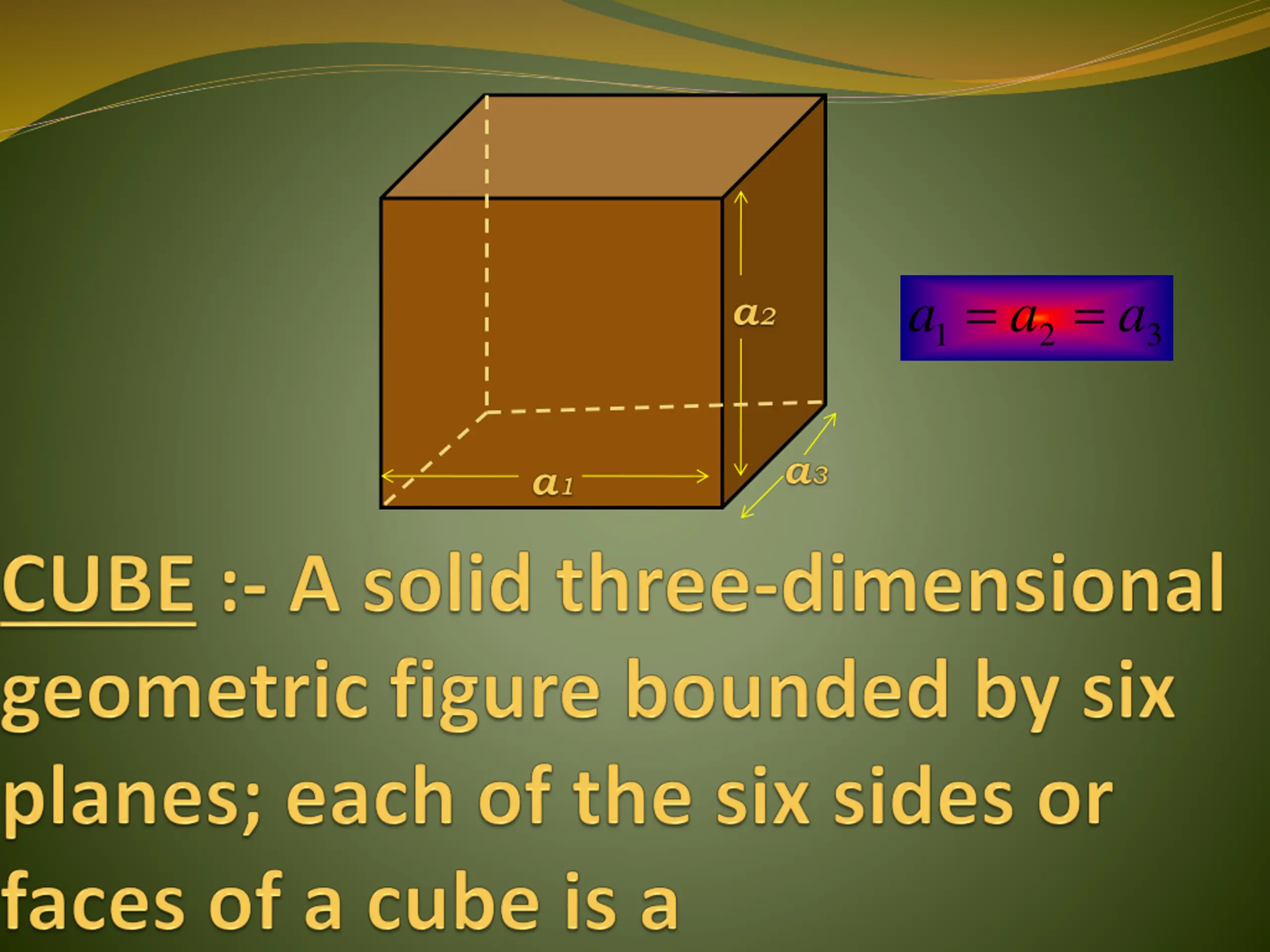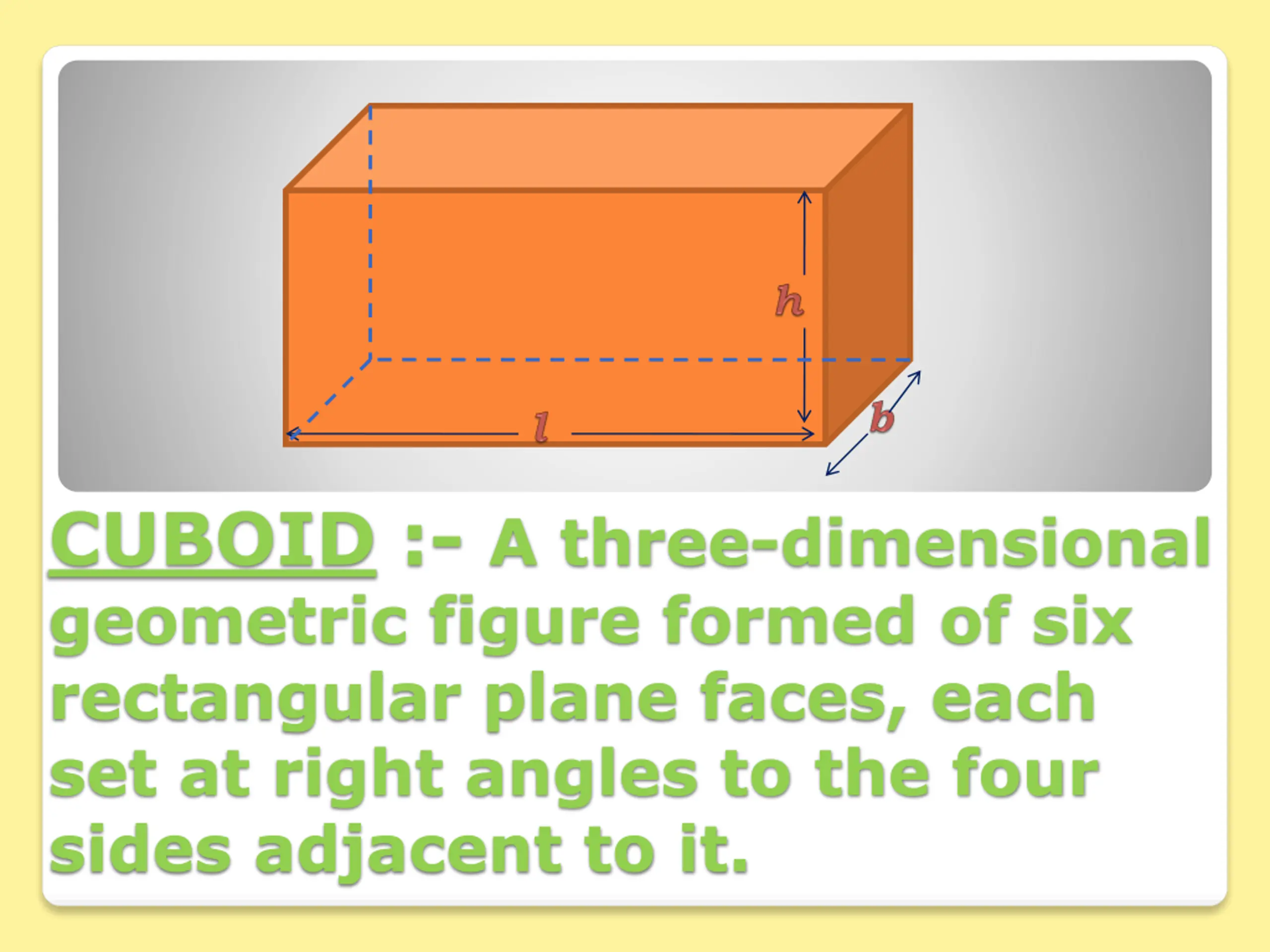 CUBOID :- A three-dimensional geometric figure formed of six rectangular plane faces, each set at right angles to the four sides adjacent to it.