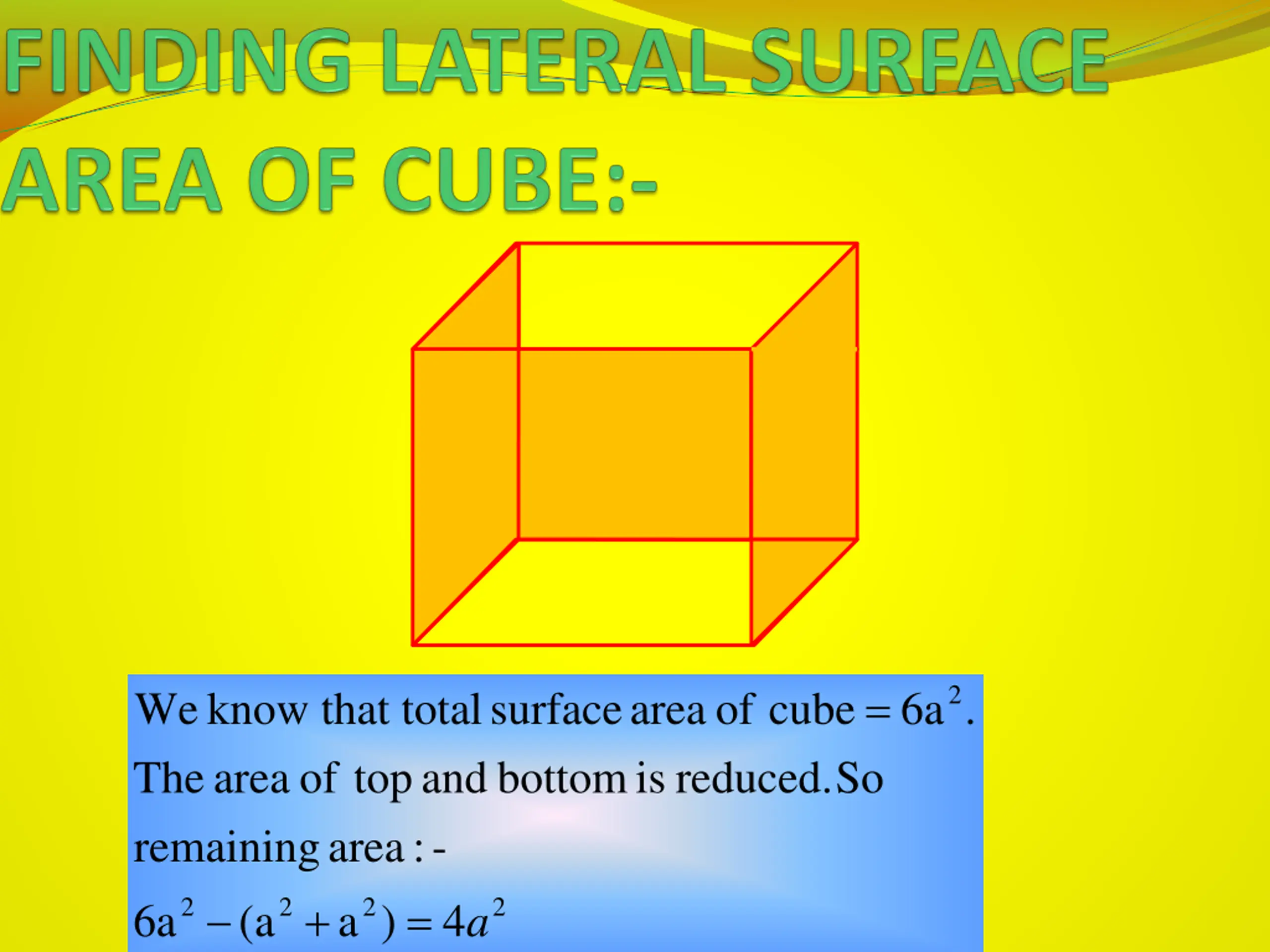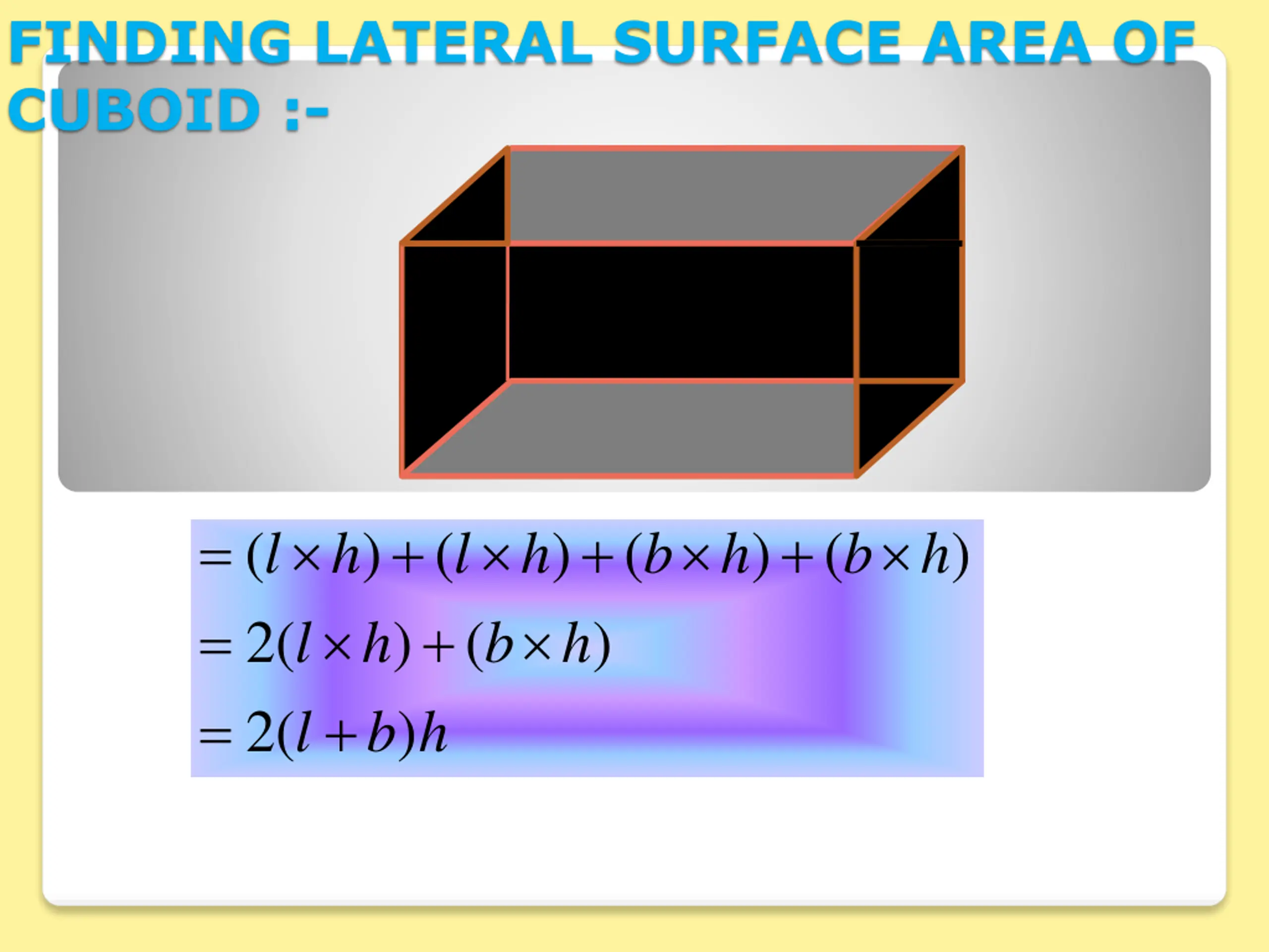 FINDING LATERAL SURFACE AREA OF CUBOID :- = + + + ( ) ( ) ( ) ( ) l h l h b h b h = + ( 2 ) ( ) l h b h = + ( 2 ) l b h