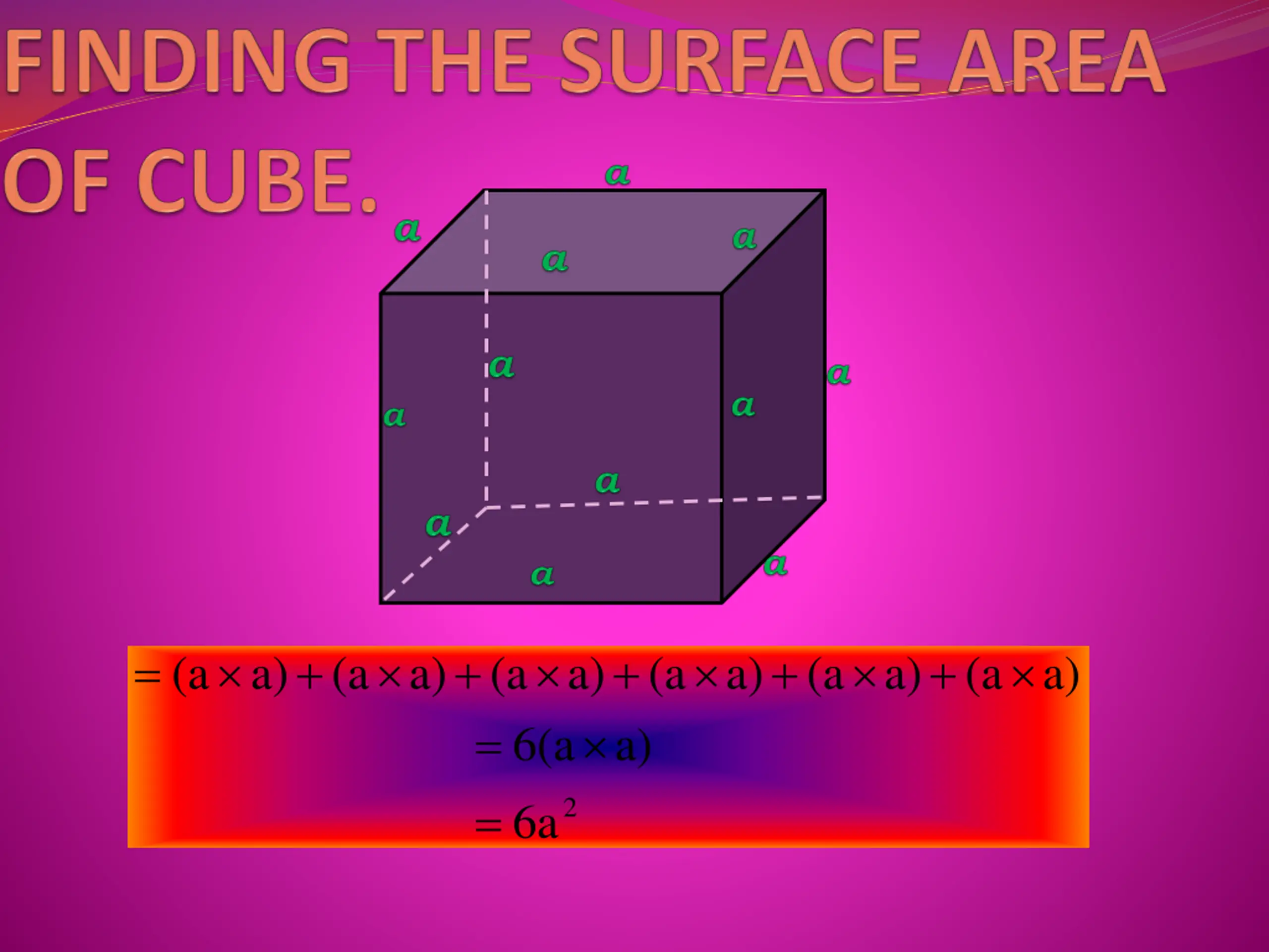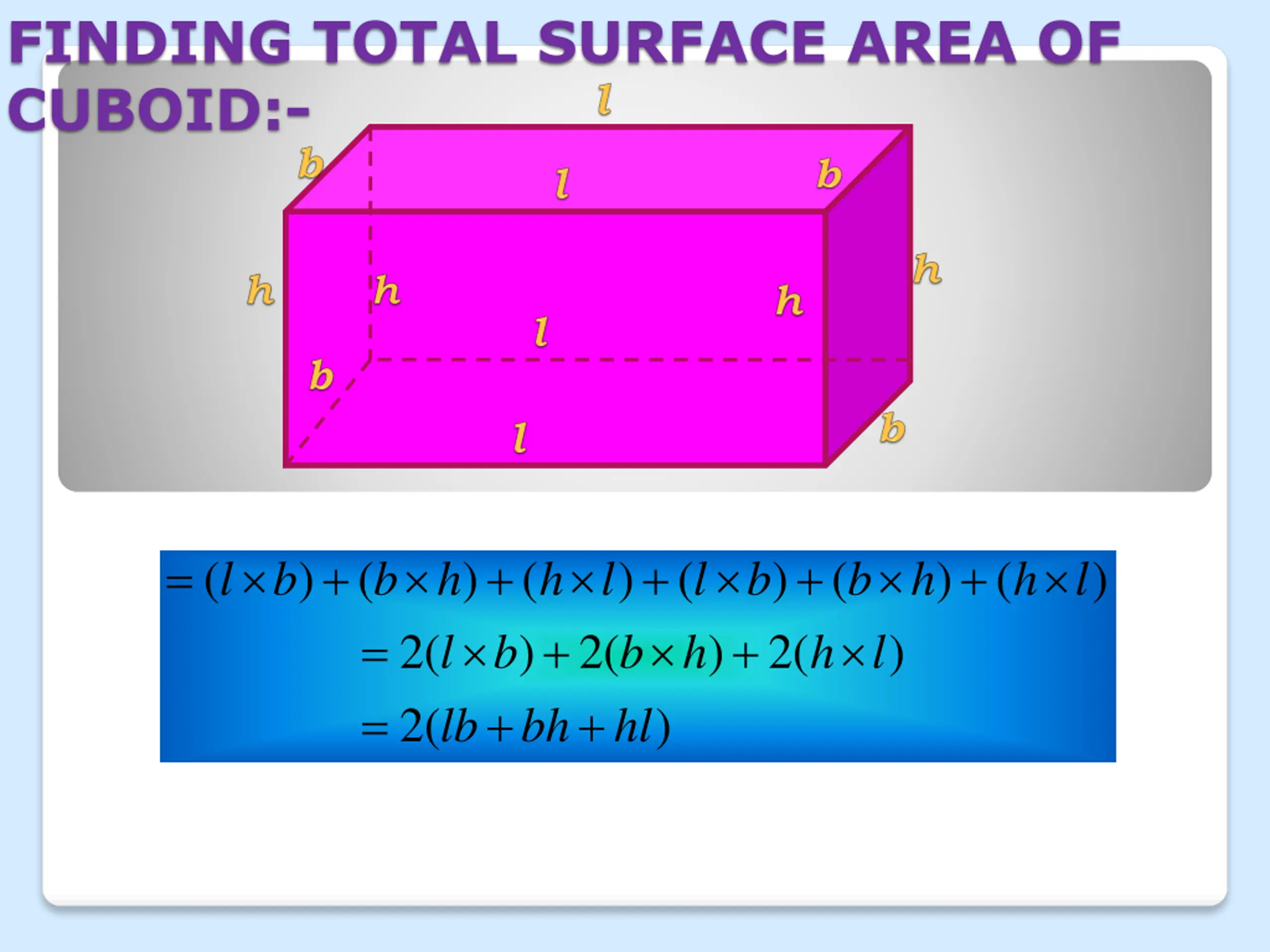 FINDING TOTAL SURFACE AREA OF CUBOID:- = + + + + + ( ) ( = ) ( ) b ( h ) ( ) ( ) l b b h h + l l b b h h l + ( 2 ) bh ( 2 + ) ( 2 ) l b + h l = 2( ) lb hl