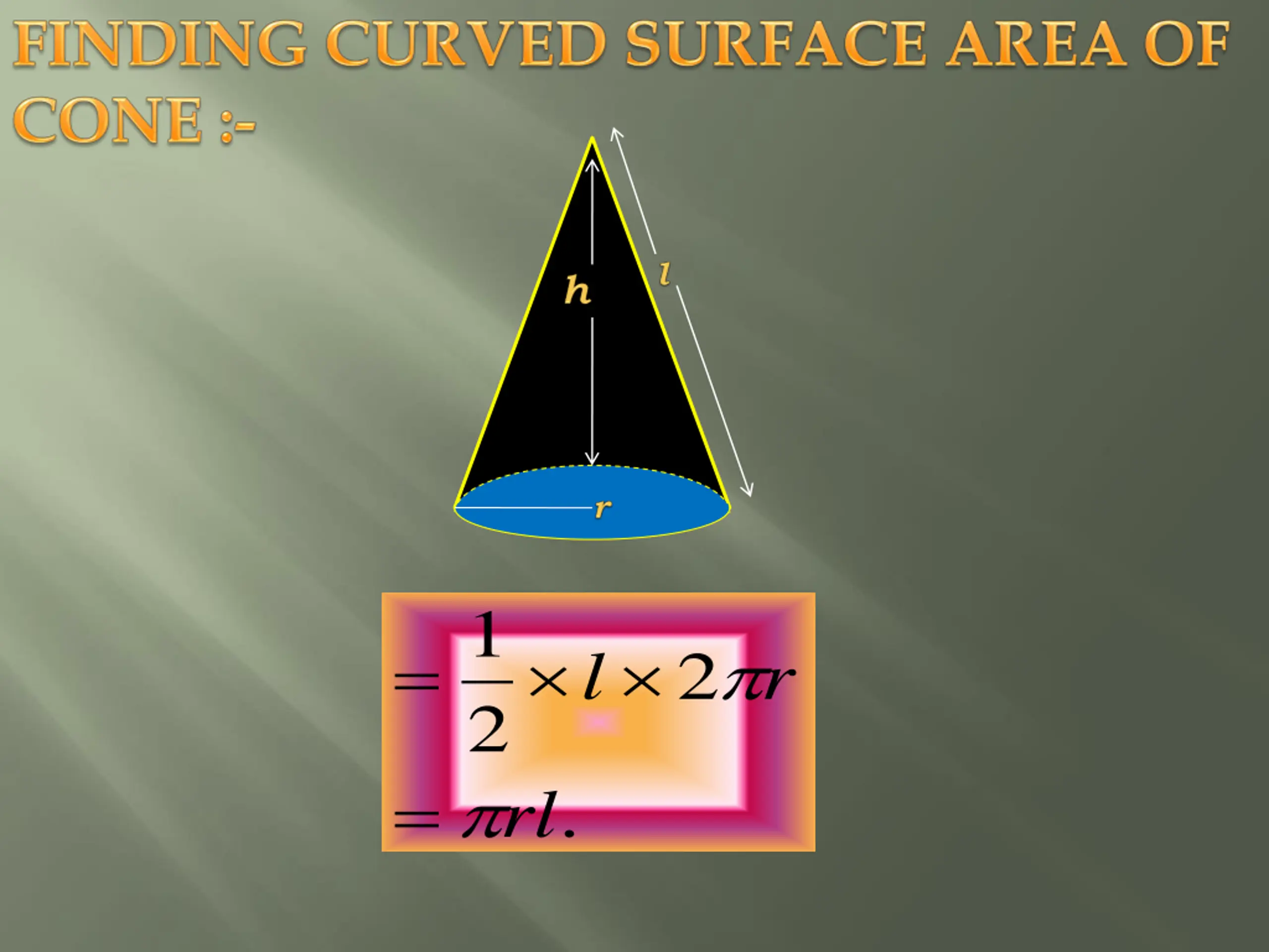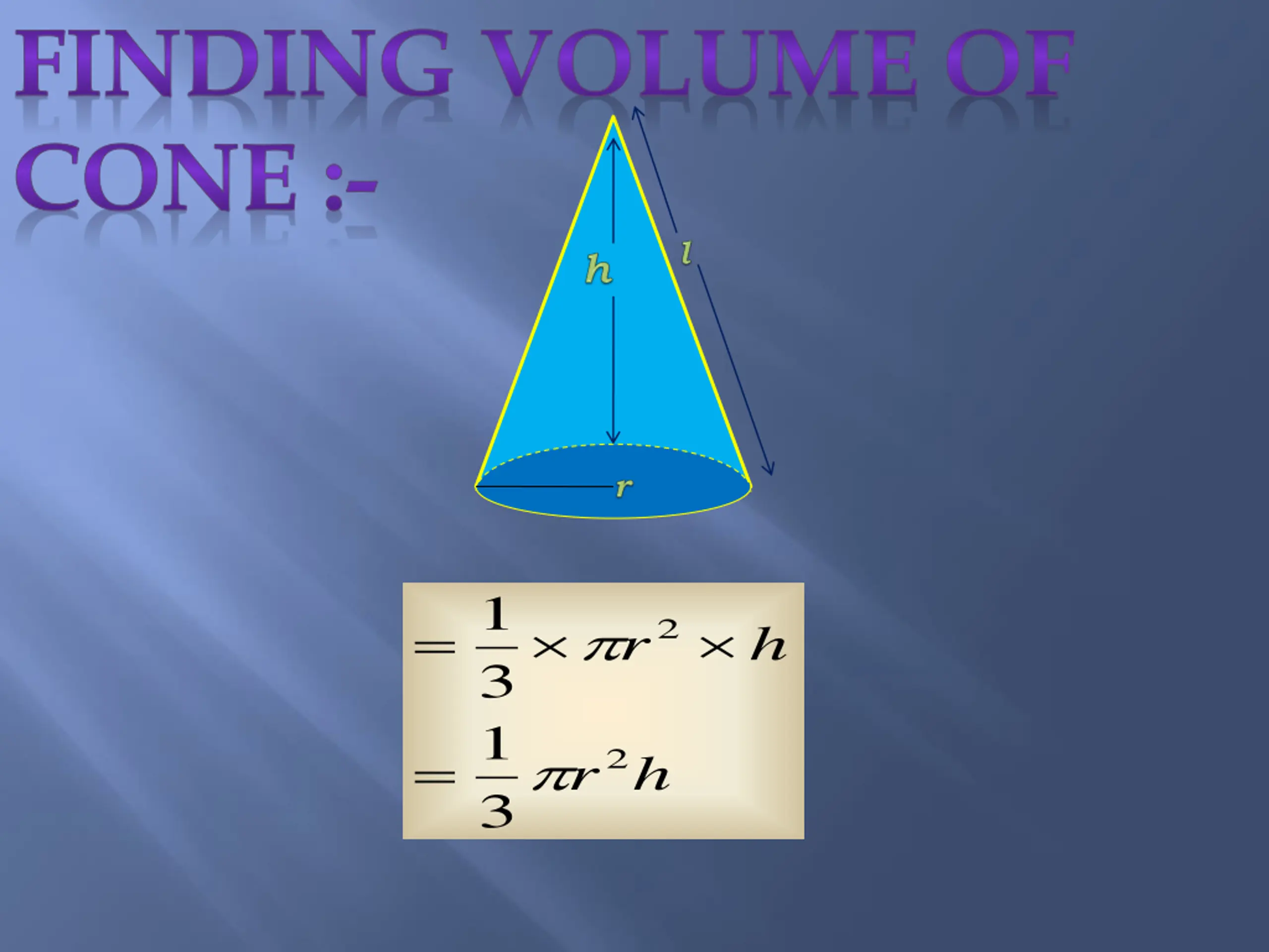 FINDING VOLUME OF CONE :- 1 = 2 r h 3 1 = 2 r h 3