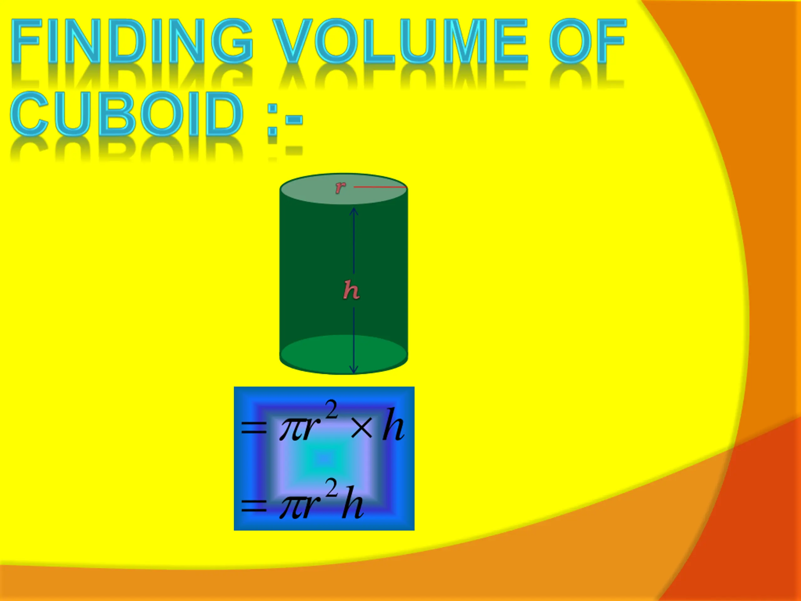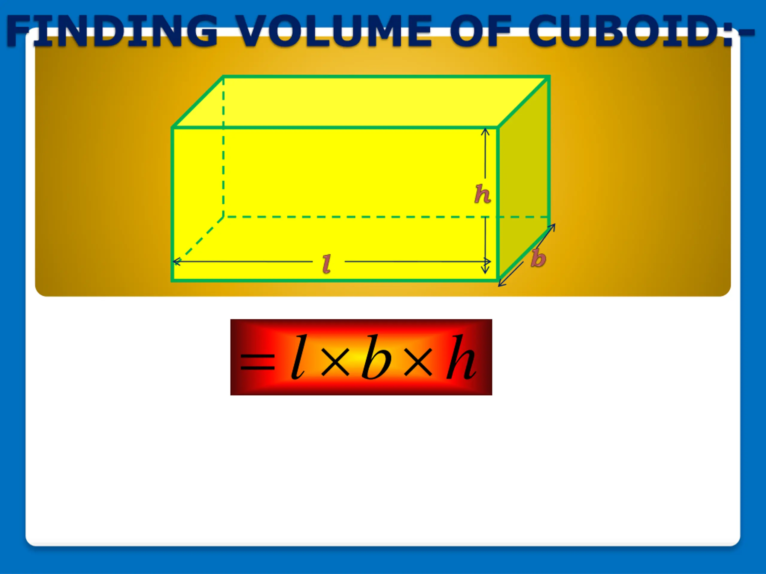 FINDING VOLUME OF CUBOID:- = l b h