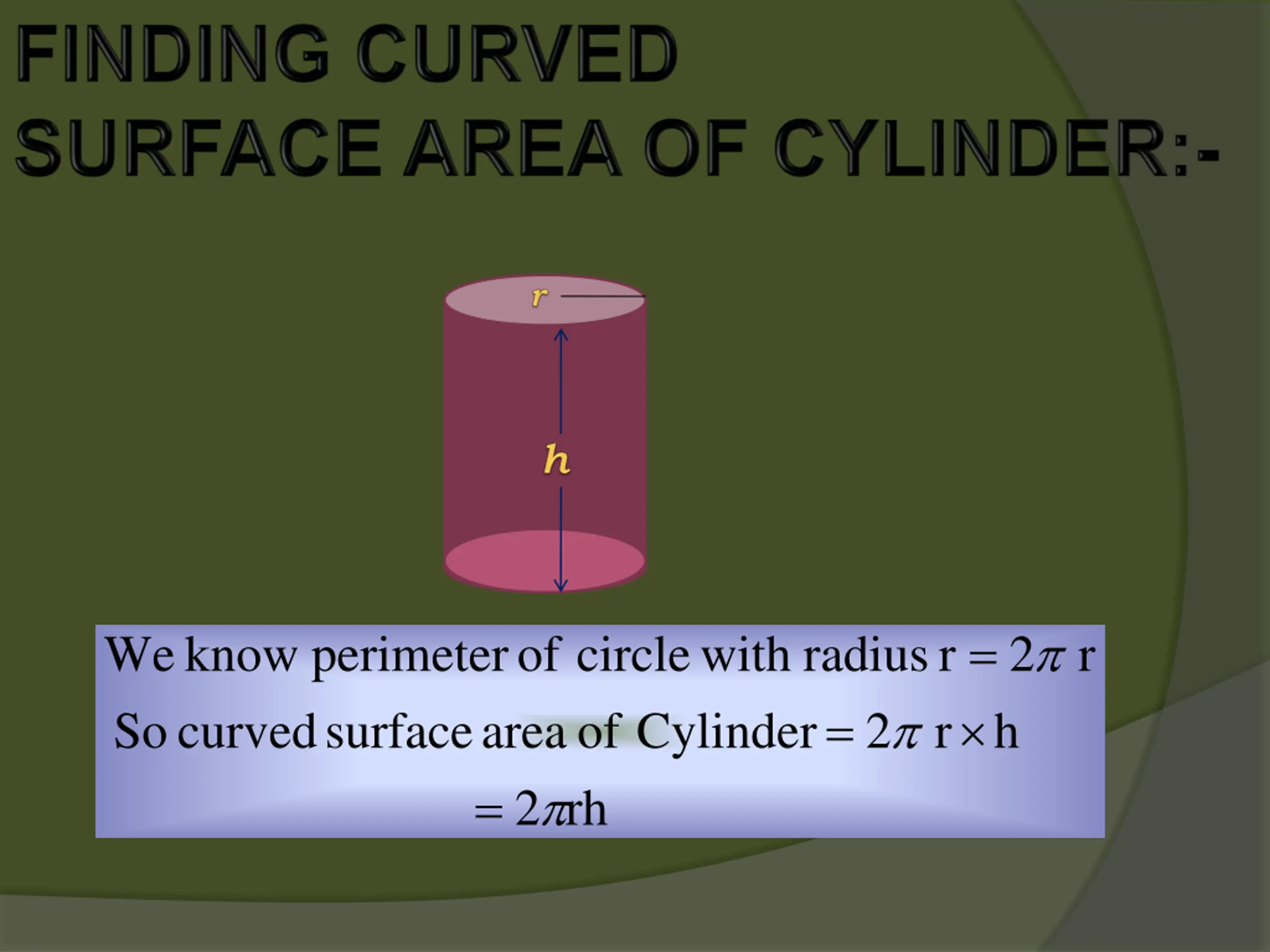 = We know perimeter of circle with radius = r 2 r curved So surface area = of Cylinder 2 r h 2 rh
