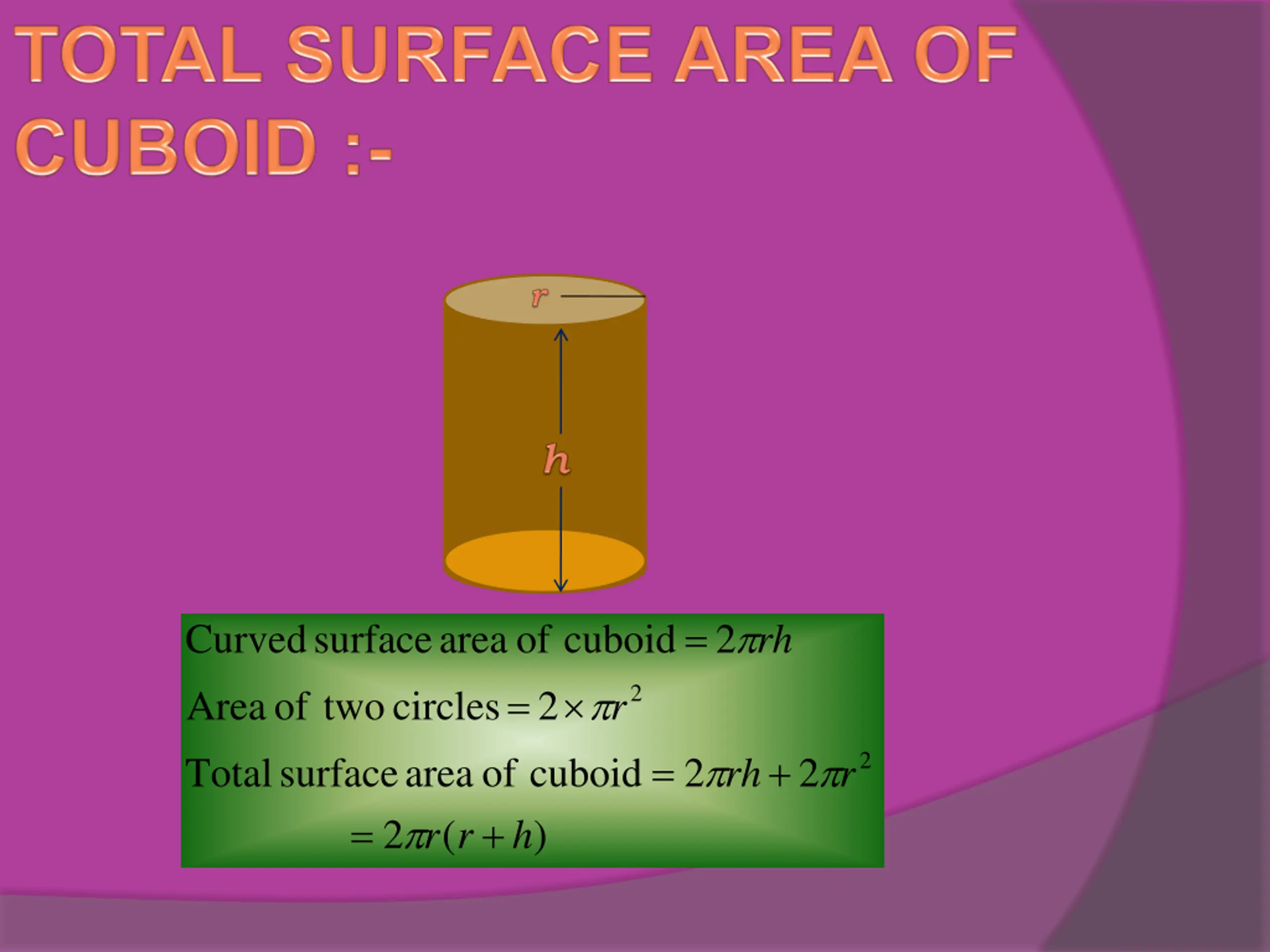 2 = Curved surface area of cuboid rh 2 = 2 Area of two circles r = + 2 Total surface area r of + cuboid h 2 2 rh r = 2 ( ) r