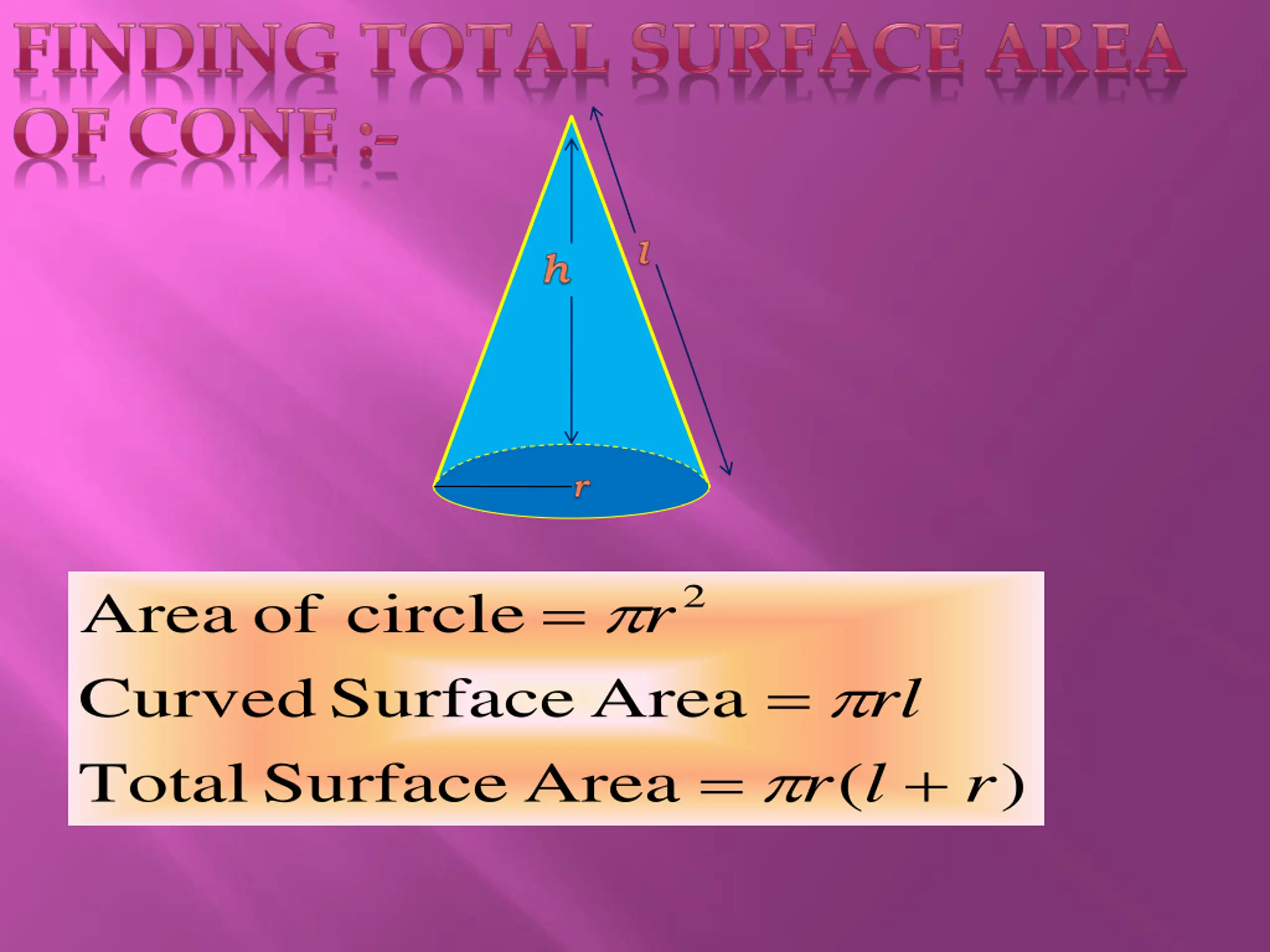 = 2 Area of circle r = Curved Surface Area rl = + Total Surface Area ( ) r l r