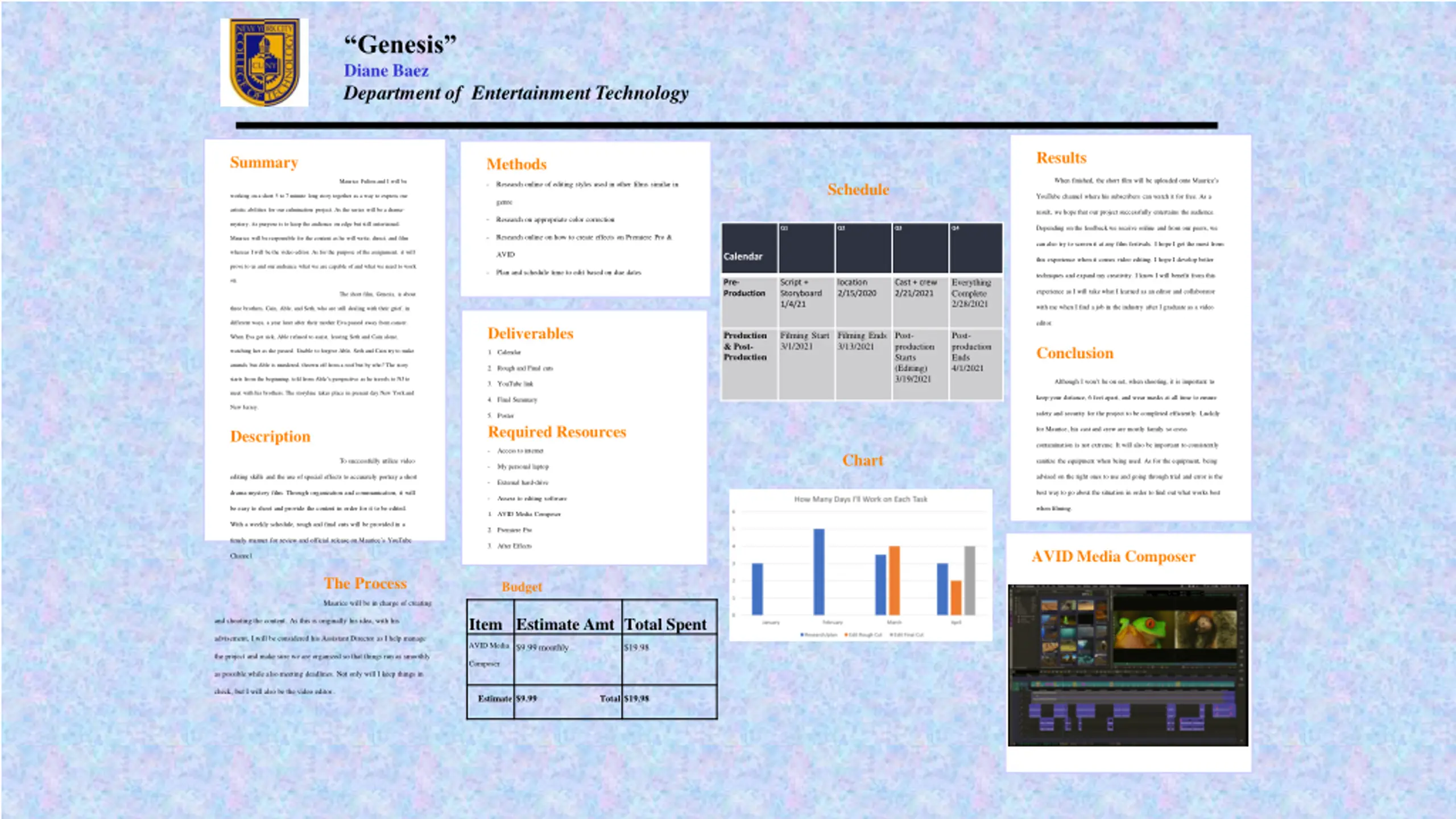 Genesis Diane Baez Department of Entertainment Technology Results Summary Methods When finished, the short film will be uploaded onto Maurice s Maurice Fulton and I will be Schedule - Research online of editing styles used in other films similar in working on a short 5 to 7 minute long story together as a way to express our YouTube channel where his subscribers can watch it for free. As a genre artistic abilities for our culmination project. As the series will be a drama- result, we hope that our project successfully entertains the audience. - Research on appropriate color correction mystery, its purpose is to keep the audience on edge but still entertained. Depending on the feedback we receive online and from our peers, we Q1 Q2 Q3 Q4 - Research online on how to create effects on Premiere Pro & Maurice will be responsible for the content as he will write, direct, and film can also try to screen it at any film festivals. I hope I get the most from whereas I will be the video editor. As for the purpose of the assignment, it will AVID Calendar this experience when it comes video editing. I hope I develop better prove to us and our audience what we are capable of and what we need to work - Plan and schedule time to edit based on due dates techniques and expand my creativity. I know I will benefit from this on. Everything Complete 2/28/2021 Pre- Production Script + Storyboard 1/4/21 location 2/15/2020 Cast + crew 2/21/2021 experience as I will take what I learned as an editor and collaborator The short film, Genesis, is about with me when I find a job in the industry after I graduate as a video three brothers, Cain, Able, and Seth, who are still dealing with their grief, in different ways, a year later after their mother Eva passed away from cancer. editor. Deliverables Production & Post- Production Filming Start 3/1/2021 Filming Ends 3/13/2021 Post- production Starts (Editing) 3/19/2021 Post- production Ends 4/1/2021 When Eva got sick, Able refused to assist, leaving Seth and Cain alone, Conclusion watching her as she passed. Unable to forgive Able, Seth and Cain try to make 1. Calendar amends but Able is murdered, thrown off from a roof but by who? The story 2. Rough and Final cuts starts from the beginning, told from Able s perspective as he travels to NJ to Although I won t be on set, when shooting, it is important to 3. YouTube link meet with his brothers. The storyline takes place in present day New York and keep your distance, 6 feet apart, and wear masks at all time to ensure 4. Final Summary New Jersey. safety and security for the project to be completed efficiently. Luckily 5. Poster Required Resources for Maurice, his cast and crew are mostly family so cross Description contamination is not extreme. It will also be important to consistently - Access to internet Chart sanitize the equipment when being used. As for the equipment, being To successfully utilize video - My personal laptop advised on the right ones to use and going through trial and error is the editing skills and the use of special effects to accurately portray a short - External hard-drive best way to go about the situation in order to find out what works best drama-mystery film. Through organization and communication, it will - Assess to editing software when filming. be easy to shoot and provide the content in order for it to be edited. 1. AVID Media Composer With a weekly schedule, rough and final cuts will be provided in a 2. Premiere Pro timely manner for review and official release on Maurice s YouTube 3. After Effects AVID Media Composer Channel. The Process Budget Maurice will be in charge of creating Item Estimate Amt Total Spent and shooting the content. As this is originally his idea, with his advisement, I will be considered his Assistant Director as I help manage AVID Media $9.99 monthly $19.98 the project and make sure we are organized so that things run as smoothly Composer as possible while also meeting deadlines. Not only will I keep things in check, but I will also be the video editor.. Estimate $9.99 Total $19.98