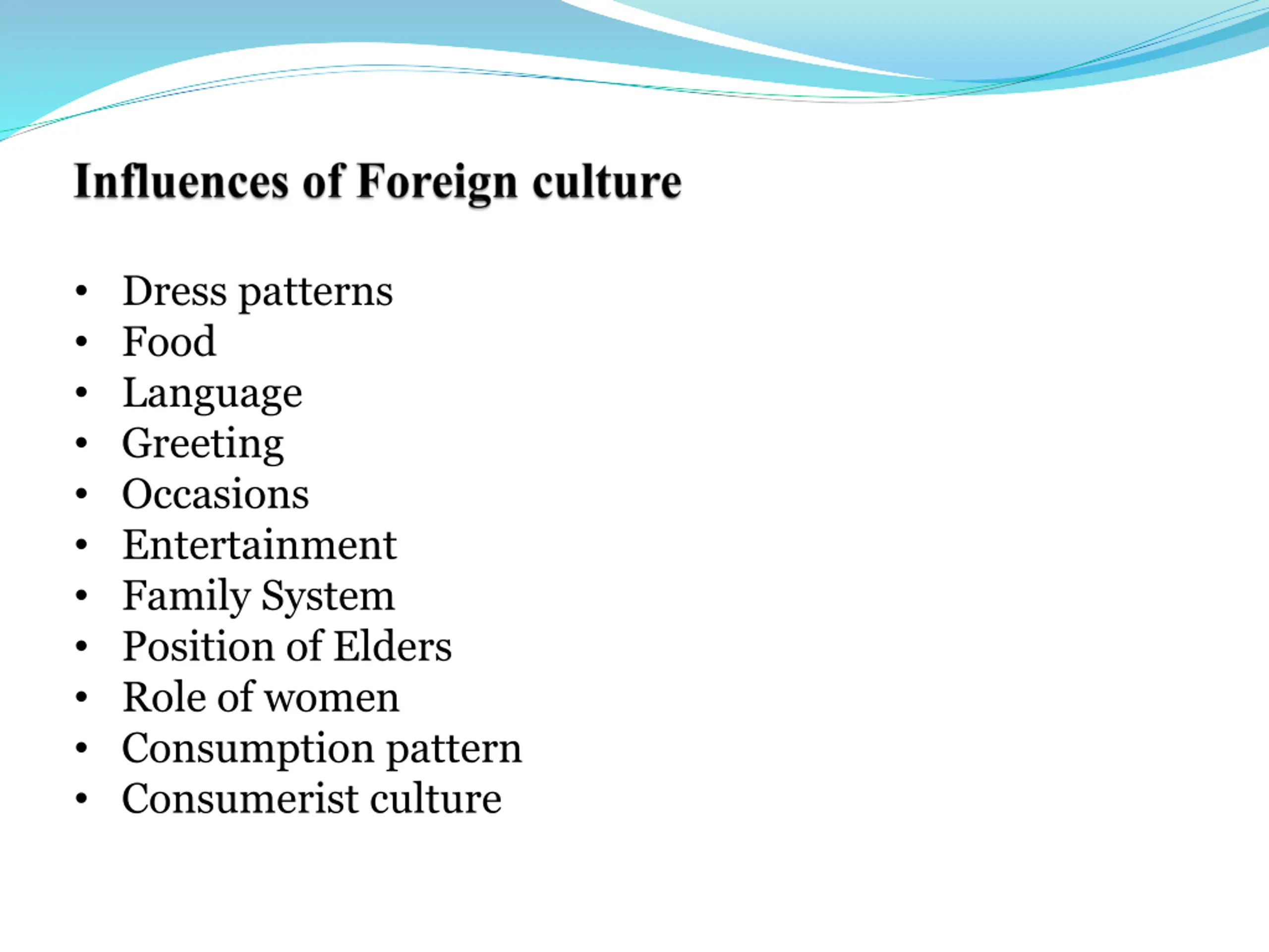 Dress patterns Food Language Greeting Occasions Entertainment Family System Position of Elders Role of women Consumption pattern Consumerist culture