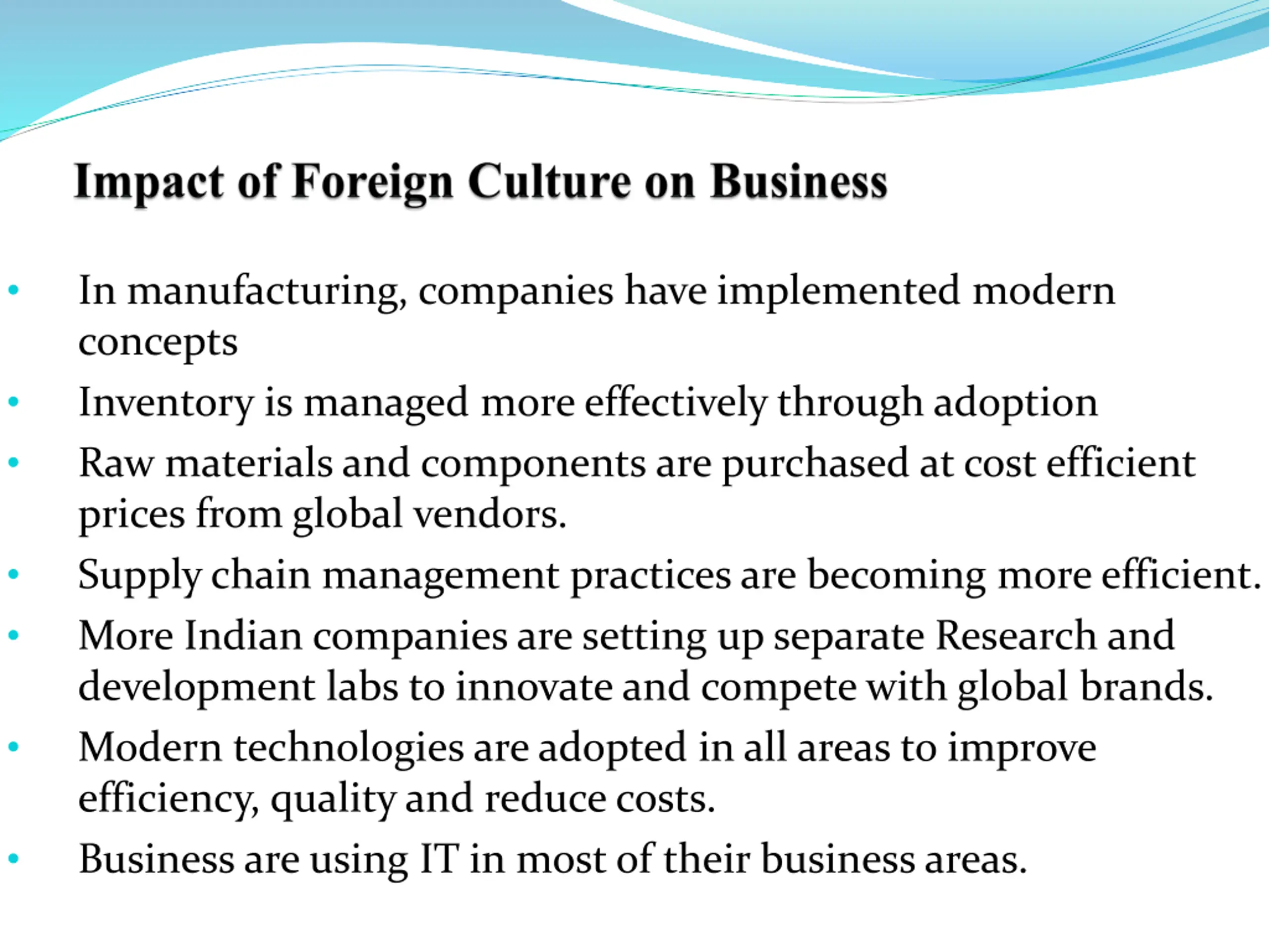 In manufacturing, companies have implemented modern concepts Inventory is managed more effectively through adoption Raw materials and components are purchased at cost efficient prices from global vendors. Supply chain management practices are becoming more efficient. More Indian companies are setting up separate Research and development labs to innovate and compete with global brands. Modern technologies are adopted in all areas to improve efficiency, quality and reduce costs. Business are using IT in most of their business areas.