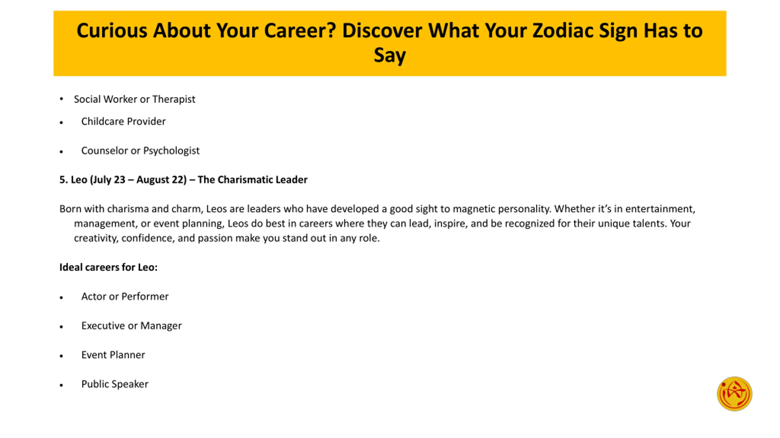 Curious About Your Career? Discover What Your Zodiac Sign Has to Say Social Worker or Therapist Childcare Provider Counselor or Psychologist 5. Leo (July 23 August 22) The Charismatic Leader Born with charisma and charm, Leos are leaders who have developed a good sight to magnetic personality. Whether it s in entertainment, management, or event planning, Leos do best in careers where they can lead, inspire, and be recognized for their unique talents. Your creativity, confidence, and passion make you stand out in any role. Ideal careers for Leo: Actor or Performer Executive or Manager Event Planner Public Speaker