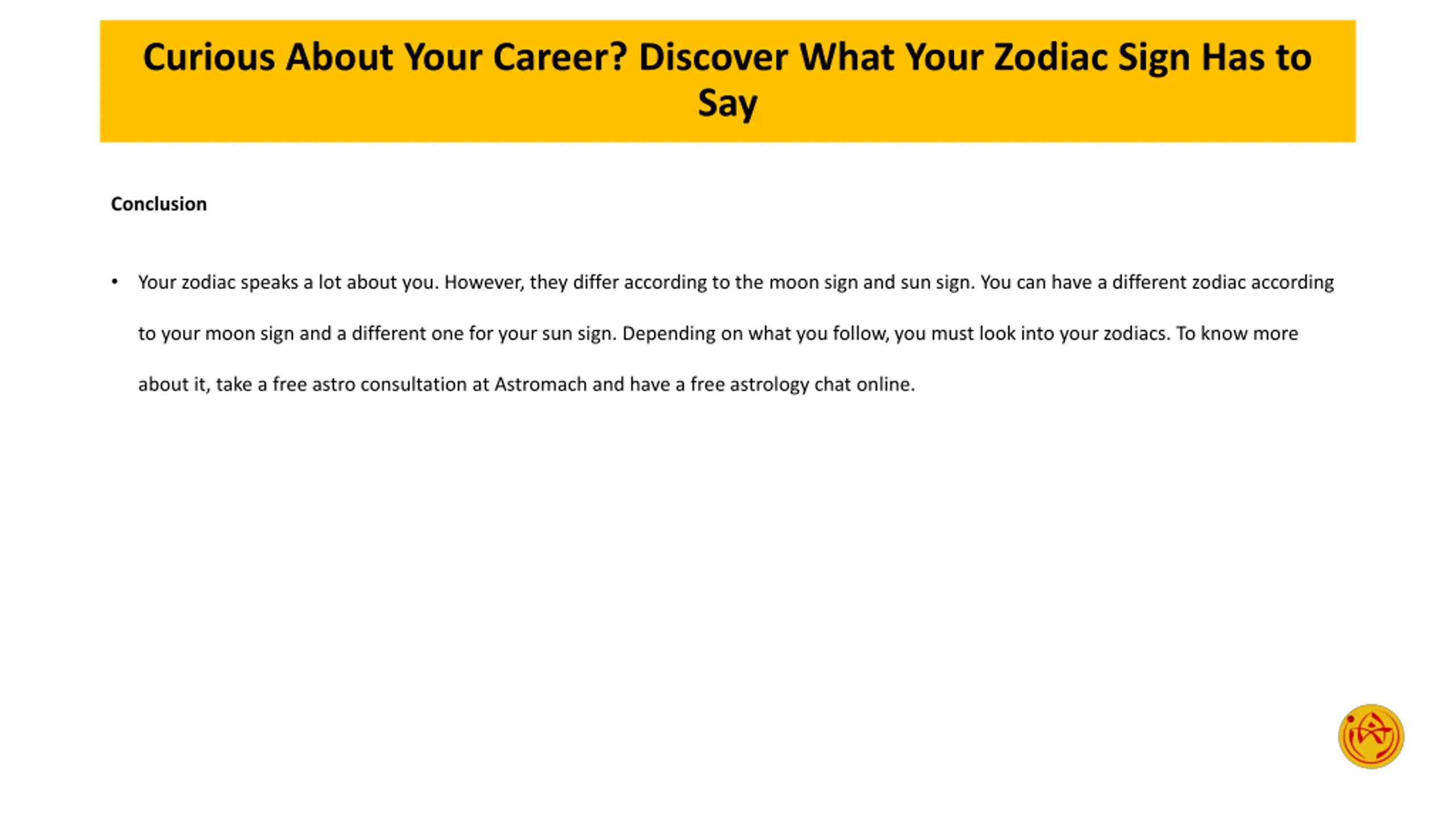 Curious About Your Career? Discover What Your Zodiac Sign Has to Say Conclusion Your zodiac speaks a lot about you. However, they differ according to the moon sign and sun sign. You can have a different zodiac according to your moon sign and a different one for your sun sign. Depending on what you follow, you must look into your zodiacs. To know more about it, take a free astro consultation at Astromach and have a free astrology chat online.