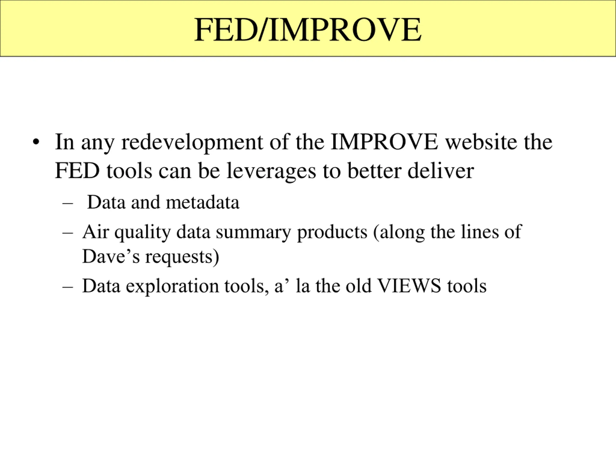 FED/IMPROVE In any redevelopment of the IMPROVE website the FED tools can be leverages to better deliver Data and metadata Air quality data summary products (along the lines of Dave s requests) Data exploration tools, a la the old VIEWS tools