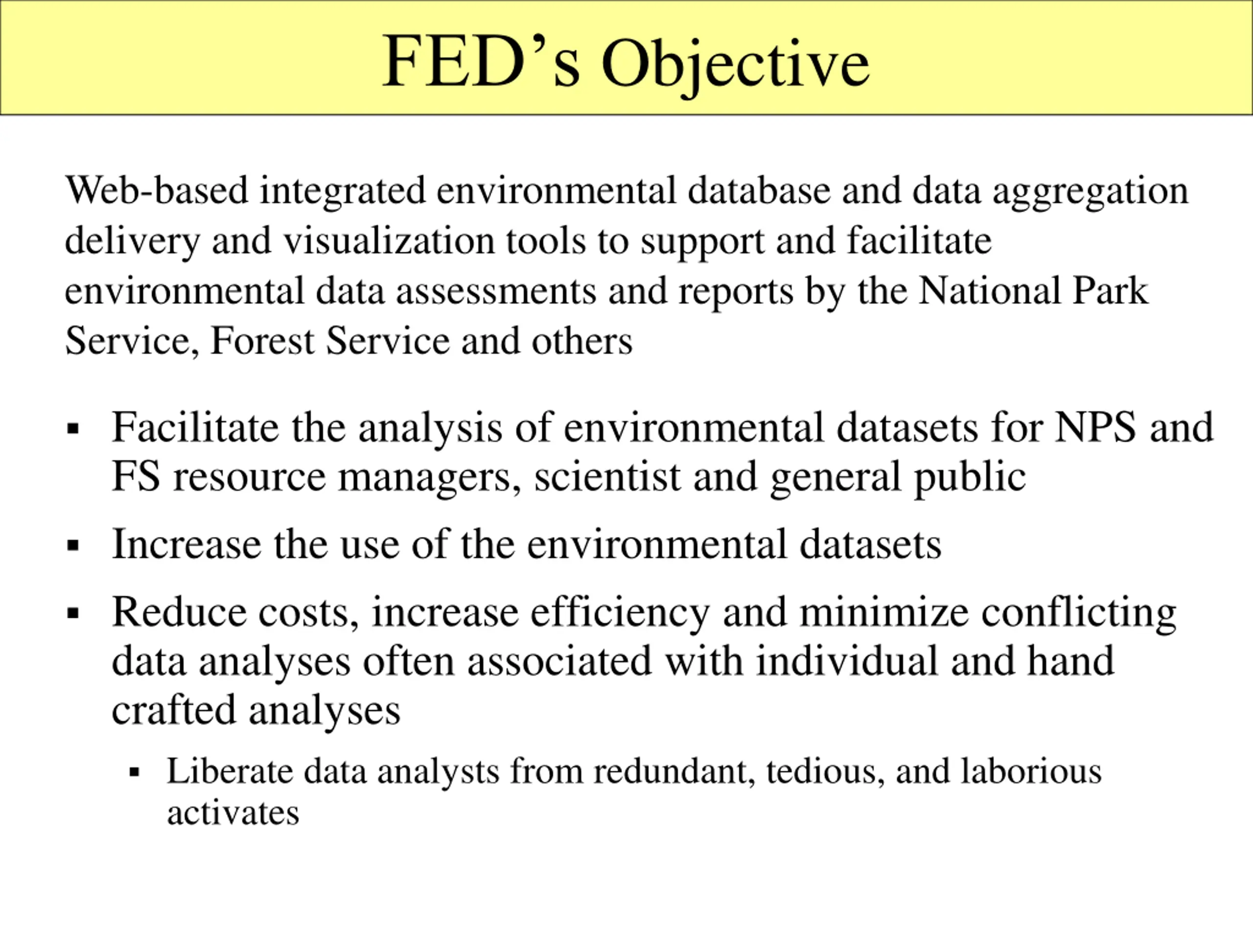 FEDs Objective Web-based integrated environmental database and data aggregation delivery and visualization tools to support and facilitate environmental data assessments and reports by the National Park Service, Forest Service and others Facilitate the analysis of environmental datasets for NPS and FS resource managers, scientist and general public Increase the use of the environmental datasets Reduce costs, increase efficiency and minimize conflicting data analyses often associated with individual and hand crafted analyses Liberate data analysts from redundant, tedious, and laborious activates