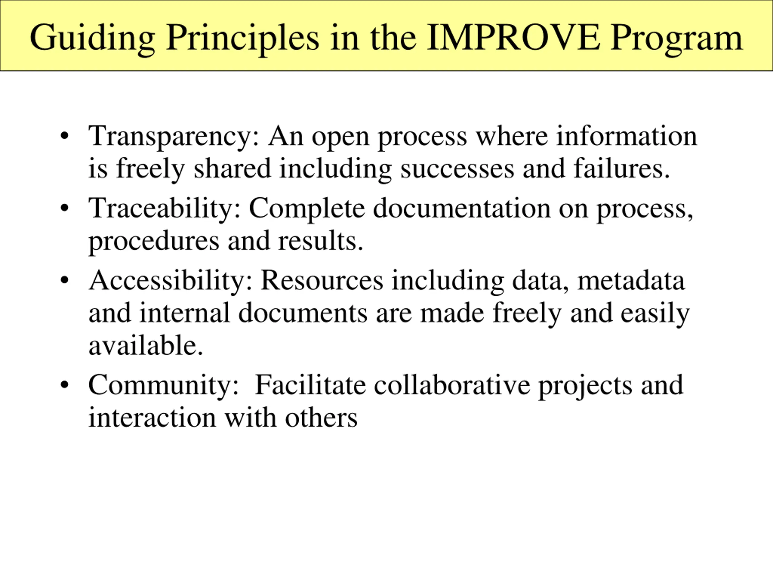 Guiding Principles in the IMPROVE Program Transparency: An open process where information is freely shared including successes and failures. Traceability: Complete documentation on process, procedures and results. Accessibility: Resources including data, metadata and internal documents are made freely and easily available. Community: Facilitate collaborative projects and interaction with others