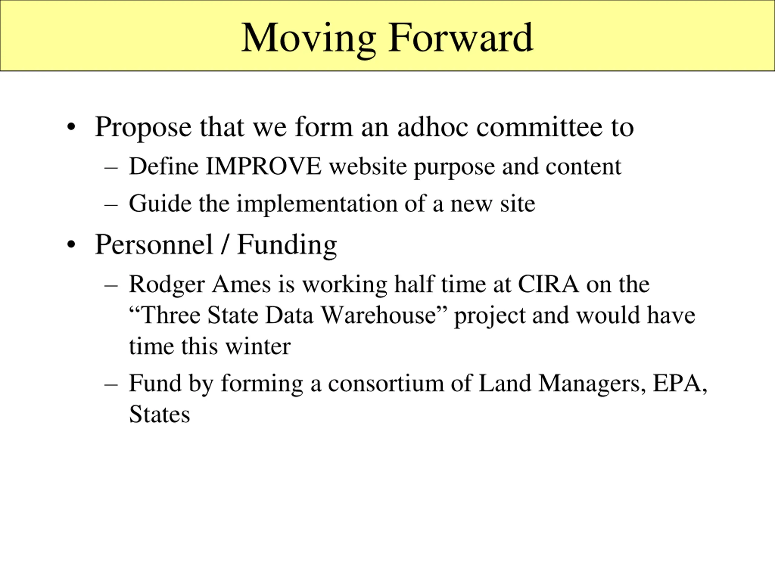 Moving Forward Propose that we form an adhoc committee to Define IMPROVE website purpose and content Guide the implementation of a new site Personnel / Funding Rodger Ames is working half time at CIRA on the Three State Data Warehouse project and would have time this winter Fund by forming a consortium of Land Managers, EPA, States
