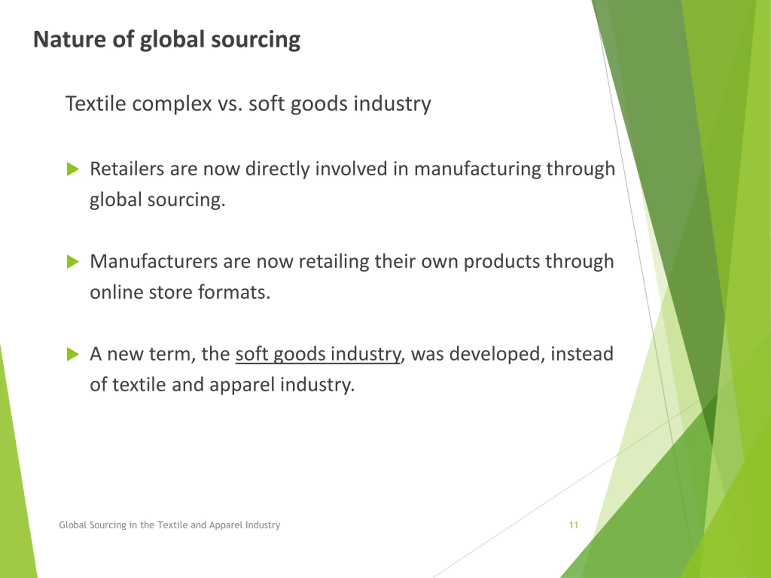 Nature of global sourcing Business types Textile complex vs. soft goods industry Retailers are now directly involved in manufacturing through global sourcing. Manufacturers are now retailing their own products through online store formats. A new term, the soft goods industry, was developed, instead of textile and apparel industry. Global Sourcing in the Textile and Apparel Industry 11