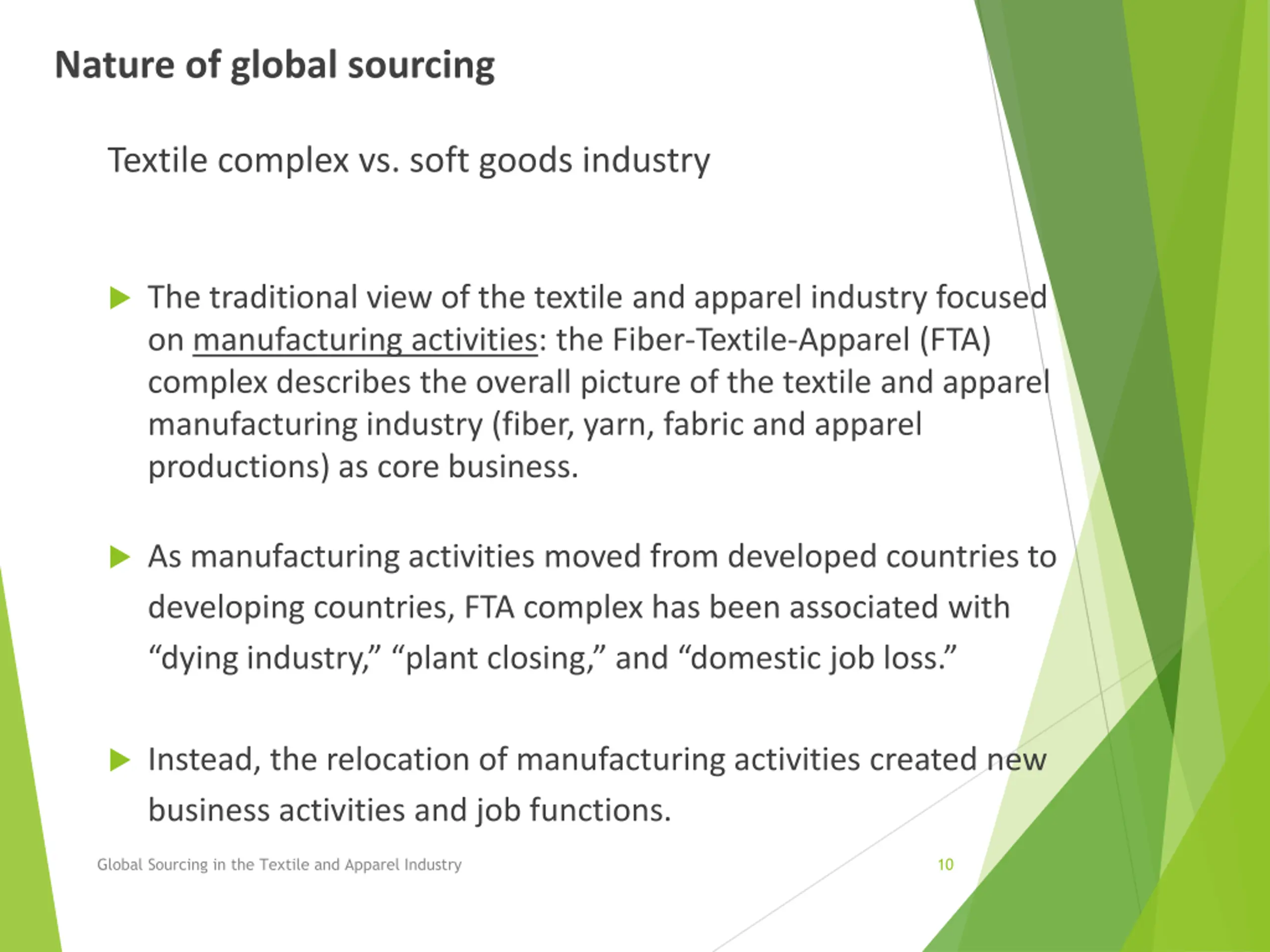 Nature of global sourcing Textile complex vs. soft goods industry The traditional view of the textile and apparel industry focused on manufacturing activities: the Fiber-Textile-Apparel (FTA) complex describes the overall picture of the textile and apparel manufacturing industry (fiber, yarn, fabric and apparel productions) as core business. As manufacturing activities moved from developed countries to developing countries, FTA complex has been associated with dying industry, plant closing, and domestic job loss. Instead, the relocation of manufacturing activities created new business activities and job functions. Global Sourcing in the Textile and Apparel Industry 10